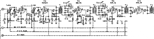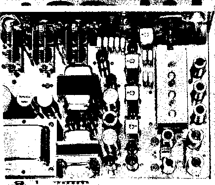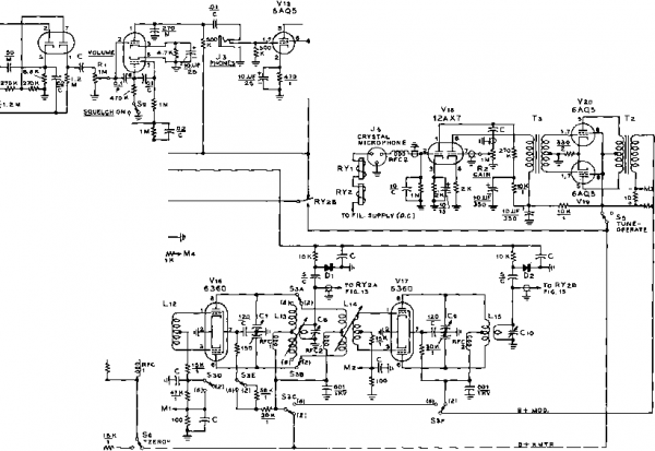 Figure 17 SCHEMATIC, TRANSMITTER AND AUDIO SECTION OF TRANSCEIVER Cs, Cj, Cs-75/75 mmW. HammatXand HFD-15X Cs, Cc-30 liiifd. Johnson 25J72 Di, Di-Germanium diode 7 N8 7 Lii-Lis-See figure 2 7 for coil information RFC-,-7.0 iih. Olimite Z-SO RFCl-1.8 fill. Ohmite Z-I44 RFC}-0.15 tih. J. W. Miner 4644 SjA-SjF-Some as 5 figure 75. Space decks so coils Li. and 1ц fit between the decks. S,-SPOr push-button switch Si-2 poie, 3 position non-shorting switch. Mallory 3223-G RY ry2-See figure 19 Мг-0-7 d.c. milliammeter. De-jur #112 Tl-25 watt modulation transformer, 10K pri., 5 К see. Stancor A-3845 Tj-Interstage transformer, 7:3. Stancor A-53C X7~-2426 Me. overtone crvstal. Precisian Crvst J Co.. Santa Manira. Calit. The Power Supply Section. The complete transceiver requires a plate supply of 250 volts at 150 milliamperes, and either 6.3 volts at 7.8 amperes or 12.6 volts at 3-9 amperes. These voltages may be obtained from the power supply whose schematic is given in figure 18. The high voltage portion of the supply employs a voltage doubler selenium-type rectifier system operating from a 117 volt half-wave winding of the power transformer. This transformer has two auxiliary windings. One winding may be used for 115 volt, 50-60 cycle operation, and the other one is intended for vibrator opera-ation from either a 6- or 12-volt dc. primary source. The choice of a.c. or d.c. operation may be made by inserting the correct terminal plug in receptacle SOi, mounted on the rear of the transceiver chassis. RFC 3 ![]() 115V. A-C PL2 ![]() 0117V. b-l-HV 6-l2V0LrFILAMENT SCHEMATIC 20 21 ! 2 7 8 Xc W сф: V2< 115V. -fV 1 i i V. < I 15 VOLT Wl RING ,-с>.ЛГ!П5>-*e.3v. !9 >0J > ~ C> I17V. О e-l2 VOLT D-C WIRING ![]() VIBl Figure 18 ![]() >V1 с =,007 CERAMIC CAPACITOR FOR 8-VOLT OPERATION JUMPER PINS г-a IN PL 1 Ъ-JUMPER PINS 7-20 /Л/ PL I . FOR 12-VOLT OPERATION 6.-JUMPER PINS 10-20 PL 1 . SCHEMATiC, POWER SUPPLY OF TRANSCEIVER CH,-4 h. ai US ma. Siancor C-1410 RFCj-4 ith., 6 amp. J. W. Miller 5221 RfC,.-2.S mh., 200 ma. J. W. Miller 5222 S, -DP5T toggle switch, 12 amp. H & H 80600-268 50i-21 terminal receptacle. Cinch-Jones P321-SB 5Ri, SR!-Selenium rectifier, 156 volt, 250 ma. International Rectifier Corp. 6R5250 PL PJ.,-2? terminal plug. Cinch-Jones S321-CCT T,-117 volts at 200 ma., three 6.3 volt windings. Stancor P-81S8 (modify as per text). VIBl-Radiart vibrator type 5503-6 (6 volt) or 5503-12 (12 volt) P,-6.3 volt, ISO ma. Pilot lamp (brown bead) St-4 pole, 2 position. Centralab PA9 deck with PA-300 hardware. The power transformer is made from a TV-replacement type, with a new vibrator winding replacing the usual 6.3 volt filament windings. Information covering the conversion of the transformer will be found later in this section. The special winding may be arranged for either 6-volt d.c. or 12- volt d.c. operation, but not both. Thus, the choice of d.c. supply voh-age must be determined before the transformer is modified. The filaments of the transceiver are arranged in a series parallel circuit so that they may be operated from either 6- or 12-volts d.c, or 6-3 volts a.c. with no change in circuitry. The appropriate filament connections to the power supply are automatically made when the proper terminal plug is inserted in SOi. A simplified drawing of the primary power wiring of the transceiver is shown in figure 18. Relay and Switching Circuits- The control circuits of the de-luxe transceiver are shown in figure 19- Two relays control change-over operation. The relay coils are of the d-c type, and are connected in series with the push-to-talk button of the microphone and the filament voltage supply. Closing the microphone switch grounds one end of the relay coil circuit and actuates both relays. Relay RYi controls the 144 Mc. antenna changeover, and switches the S-meter to the r-f output meter circuit of the transmitter section. Relay RYz conrols the 50 Mc. antenna changeover, and switches the B-plus from the receiver to the transmitter. Meter Ma serves as a multi-meter for the transmitter portion (figure 17). The basic meter has a 0-10 d.c. millammeter movement and is used as-is for measuring the grid current of Vie and ViT, Meter switching is accomplished by means of Ss. The third position of the switch connects the meter across the shunt in the plate circuit of the modulated amplifier stage. The resistance of the shunt is chosen so that full scale meter deflection is 100 milliamperes. Transceiver Layout and Assembly The transceiver is housed in a special cabinet measuring 14 long, 10 deep, and ЬУг high. The cabinet is formed from cane metal stock and has a removable front panel. The back, which is also made of solid material is welded to the wrap-around cane-metal cover. The chassis of the unit is made of sheet steel which is copper plated after all major holes have been drilled. Chassis height is 2 inches. Placement of the major components may be seen in figure 16. The receiver section occupies the right-hand por- RELAY SWITCHING CIRCUIT (SHOtTN UN£N£ReiZEO) R Yi Г-2>, R-F COIL A т-о- TO J1 XMTR ANT COIL TO V9 В ~-o- TO + S-METER j-o-* TO Vio С ~-o- TO-S-METER t-TO R-F DIODES I-o- - e\ R-F COIL A T-0-* TO J 2 t-a-m. XMTR ANT COIL о- TO RECEIVER В Г-о* то e+ JUSED TO CONTROL CIRCUIT IN MICROPHONE TO FILAMENT VOLTAGE SUPPLY TRANSCEIVER CONTROLS SWITCHES Sl-SELECTIVITY S2-XMTR CRYSTAL SS-BANDSWITCH. XMTR S4-FI LAMENT SS-TUNE-OPERATE Se- ZEROTUNE S7-BANDSWITCH, RECEIVER Sa- METER SELECTOR, XMTR s9-SQUELCH SlO-POWER (BACK OF CHASSIS) POTENTIOMETERS R 1 - RECEIVER VOLUME R2-XMTR AUDIO GAIN r3-S-METER ADJ. Figure 19 RELAY CONTROL WIRING AND LIST OF TRANSCEIVER CONTROLS RYi, RYj-3 pole, DT. Advance MF3C/6VD. Hook coils in parallel for 6 volt operation. tion of the chassis, with the power supply to the rear left, and the transmitter at the upper left of the photograph. The variable TV-type tuner is panel driven by the main tuning dial through a simple speed reduction gear (Cr