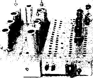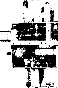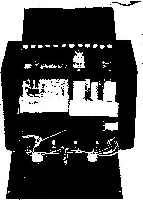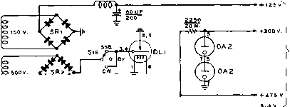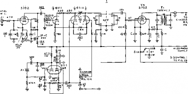 LAYOUT, CHASSIS * 1, SICE*2 Ve AND ELD V7 AND. SHIELD SHIELD fv о SHI О о WVii ,rV9 *ND 4 jmnD lELD *\ Jl KJ ---SHIELD Figure 24 BLOCK DIAGRAM AND PARTS LAYOUT OF 14 MC. SIDEBAND TRANSMITTER Fourteen tubes (including two voltage regulators) are used in this compact transmitter. A Crosby modulator and 500 fee. Collins Mechanicai Filter are employed for sideband generation. First frequency conversion is to 4 Mc, and second frequency conversion is to 14 Mc. Layout of major components on both sides and front of special chassis is shown in the ilfustratjon. Figure 25 OBLIQUE VIEW OF AMPLIFIER AND EXCITER CHASSIS The power amplifier chassis is at the left. The plate coil, plate tuning capacitor and loading switch are In the foreground. Side #1 of the exciter is shown. The Inter-chassis area is covered with perforated metai. The tip faclts for the receiver disabling circuit are on the right edge of the chassis. Corners of the mounting base are rounded to permit close tit with rounded corners of drawn aluminum case. ![]() ployed with the linear amplifier stage. In order to conserve space, the usual variable capacitor is omitted from the output side of the network and a rotary switch and selection of fixed capacitors is employed in its place. Proper choice of capacitors permits the transmitter to be matched to 52- or 72-ohm transmission lines having s.w.r. values as great as 2.5/1. The problem of obtaining the necessary d-c power from a supply that would fit within the small cabinet space was solved by employing a bridge rectifier using the new Sarkes- Tarzian silicon rectifiers. The forward voltage drop of these rectifiers is of the order of only 1.5 volts and the back resistance is extremely high. Because of the very small size, a great number of rectifiers may be placed in a small area (figure 33). Care must be taken with these rectifiers not to overload them with an accidental short circuit. Peak currents are critical because the small mass of the rectifier element will heat instantaneously and could conceivably reach failure temperature within a time lapse of a few microseconds. The use of SIDE*1 OF CHASSIS* V2A V3A V3B ![]() Ф CARRIER INSERT NOTES 1 - capacitors marked * are 240 jujuf for туре soob-31 model filter. 2- all resistors Гуг-шатт unless OrHERMflSE NOTED. 3-е- oijuf disc ceramic capacitor. 4- SUBMINIATURE TUBE SOCKET TER Ml NALS £702 eBS7 RED 5744 RED S1KC3HHC2P КС Н Н Р ![]() CHASSIS 3 ![]() ![]() ![]() CONNECTIONS ТО CHASSIS 1 t. Z e.3V. -ill C+H2 (at each ruaesocket) Figure 26 SCHEMATIC, LOW FREQUENCY SECTION AND POWER SUPPLY OF SSB TRANSMITTER DLi-Time de/oy re/oy, 45 seconds, Amperife 6N045-T. ЫогпюПу open. Tl-455 kc. miniature i-f transformer. J. W. Miller 12-C9. Remove turns from windings to resonate at 500 kc. Ti-Г50 volt, 125 ma., SOO volt, 125 ma., 6.3 volt, 4 amp. Two 115 volt, 50-60 cycle primary windings. Walgren 3266. Walgren Electric Mfg. Co., Pasadena, Calif. CH СНг- 2 henry at 130 ma. Sfoncor C-2303 SR,-four sificon rectifiers. Max. inverse volts = 280. Sarfies-Tarzian M-500 or 1Ы1084 SR,-Eiglit sificon rect;/iers, two in series for eoch leg. Max. inverse volts - 280. Sarkes-Tarzian M-500 or 1N1084 MF-Callings Mechanical Filter, 3.1 kc. bandwidth, 500 kc. center frequency. Type 500B-31 Xi-Approximately 498 kc. Frequency chosen to place carrier oscillator at 20 db. down point on filter curve (see filter data sheet). RFC-2,5 mh. miniature r-f choke. Millen J300-2500. S,-See figure 29 Figure 27 INTERIOR OF LOW FREQUENCY PORTION OF FILTER TYPE SSB TRANSMITTER 500 kc. filter and low frequency components are on the bottom deck of the chassis. Small components are mounted between socket pins and miniature tie-point terminals. Interior shield isolates low frequency section from conversion oscillators and 4 Me. amplifier stages. The twenty meter conversion crystal Хз projects through the front panel of the transmitter (left). Note that transformers are mounted below chassis level to bring overall height even with that of miniature tubes. 6BK7A amplifier tube is also sub-mounted. Power leads that pass through Inter-stage shielding are routed through feed-thtu type ceramic insulators (Centralab type FT-1000), ![]() ![]() an auxiliary supply for tuning operations, therefore, is highly recommended. Transmitter Loyout and Assembly The transmitter is built in three sections which are held together by a common front panel. The exciter (figure 27), the linear amplifier (figure 31), and the power supply (figure 33) make up these three sections. When the three sections are placed in position they appear as in figure 32. A rear view of the complete transmitter (minus the case) is shown in figure 28. The sections are bolted together and the complete assembly is fastened to the front panel. Because space is at a premium in such a configuration, each chassis is individually designed and shaped to fit the unusual layout. A sketch of the exciter chassis is shown in figure 24. It is formed from two sides and a base. The base mounts in a vertical position in the completed assembly (see figure 28). Side #1 of the exciter chassis contains the low frequency portion of the exciter and can be seen in figure 26, and the actual placement of major components is shown in figures 25 and 27. The mechanical filter occupies the upper right portion of the deck. Input and output circuits of the filter are isolated by a shield parthion that passes across the midsection of the filter. This shield also braces side #1 to the interior full-length shield seen in figure 27. Power leads from this portion of the exciter pass through .001 niiid. Centralab type FT ceramic feed-through capacitors. These capacitors are employed wherever power leads pass through an interstage shield. Note that coupling transformer Tl is submounted to bring its height in line with that of the sub-miniature tubes. All components are mounted on this side of the chassis and it is wired before it is att