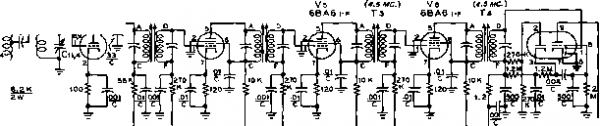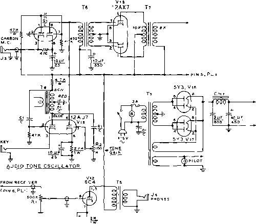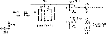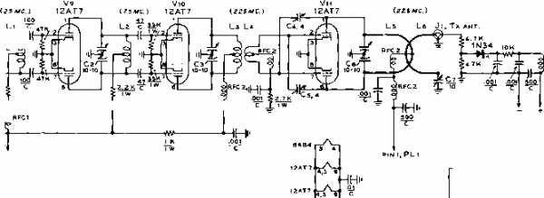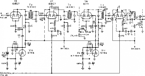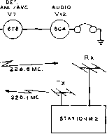![]() VHF RADIO LINK* MODULATOR Vl3 SPEECH Vl4 4J3-©- jCARBON -1-300 V. AT 210 MA. ICROPHONE RECT Vie (5ГЗ, 5Y3 1 1 RECT. Vl7 AUDIO OSC. V15 Figure 35 BLOCK DIAGRAM OF 220 MC. TRANSMITTER-RECEIVER Seventeen tubes are employed in the VHF station. The receiver has two grounded grid r-f stages for maximum sensitivity. Local oscillator injection is provided from the transmitter. Three 4.5 Mc i-f stages provide excellent gain and adequate selectivity.Transmitter is crystal controlled from 25 Mc. crystal and is plate modulated. Power supply provides 300 volts at 210 mtlliomperes. Transmitter draws 80 milliamperes, receiver draws 75 milliamperes, and modulator draws approximately 45 milliamperes under 100% modulation. Speech system is designated to be used with high gain mobile-type carbon microphone. ![]() Figure 36 REMOVAL OF FRONT PANEL SHOWS PLACEMENT OF R-F CHASSIS The receiver and transmitter sections are bolted together ta form a single unit which sits near the top edges of the power transformer and modulator chassis. Power supply chassis is bolted ta cabinet on edge along left hand side, and modulator chassis is attached in the same fashion along the right hand side of the cabinet. Ventilation holes are drilled along upper edge of rear portion of cabinet. the linear amplifier stage. Bias voltage should be applied to the 6524 and meter switch Se set to the grid position. With full carrier insertion, one or two milliamperes of grid current will flow. The stage is neutralized by adjusting capacitor Ci for minimum grid current fluctuation as the plate circuit is tuned through resonance. A dummy load is then attached to the antenna receptacle (JO and the amplifier stage tuned in the usual manner. Make sure that plate voltage is never removed when excitation is applied to the tube as the screen current will increase to such a value as to endanger the tube. Always remove the screen lead when you remove the plate voltage. When the carrier is nulled out, the resting plate current of the linear amplifier will be about 20 тз., rising to about 100 ma. under voice peaks. No grid current should be indicated under these conditions. 28-5 A Duplex Transmitter-Receiver for 220 Mc Duplex operation is permitted in the 220 Mc. amateur band and opens interesting possibilities for unusual and novel forms of equipment. This class of operation consists of two one-way communication links separated in frequency from each other sufficiently to permit interference-free operation. The width of the 220 Mc. band permits placing one link at the low frequency end of the band and the other link near the high frequency end of the band without the danger of excessive interference between the links. Shown in figure 35 is the block diagram of a transmitter-receiver unit designed to serve as one end of a typical duplex communication link. Transmission takes place on 224.6 Mc, and reception takes place on 220.1 Mc- The frequency separation between the two links is 4.5 Mc At the opposite end of the link, transmission takes place on 220.1 Mc, and reception takes place on 224.6 Mc. The complete duplex station is built within a single cabinet and employs a common power supply. Separate antennas are used for transmission and reception, and communication is maintained in the same manner as in the case of a land-line, that is, simultaneous reception and transmission are possible. Transmitter-Receiver Circuitry The schematic of the transmitter - receiver is given in figure 37 and figure 38. The receiver section employs eight tubes in a superheterodyne circuit having two grounded grid r-f amplifier stages (figure 35). The intermediate frequency of the receiver is 4.5 Mc. and three stages of i-f amplification are used. Since the frequency separation of the two links is 4.5 Mc. it is feasible to employ the signal from the transmitter portion of the unit as the injection frequency for the first mixer of the receiver. Thus with the use of two properly chosen transmitter crystals (one at each end of the duplex link) the two transmitter-receivers are locked on frequency and tuning of the receivers is unnecessary. The transmission frequency at each end of the circuit controls the frequency of reception of the receiver portion of the transmitter-receiver. Two 6AJ4 tubes are used in the receiver as grounded grid r-f amplifier stages. The gain per stage is quite low but is sufficient to overcome the noise level of the mixer tube (V:i). R-f energy from the transmitter section pro- TRANSMITTER SECTION 6Aa4 (2<,994 KC.) RFCIc 4.7 К nsr TRANSMITTER COIL TABLE Ll-2eT., V2 D1A., 3/4 LONG. U2- 7 Т., 1/2 DIA 1/2- LONG. 1-3-2 Т., 1/2 DIA., 1/4 LONG. 1-4- 2T, 3/8 DIA., OVER l3. l S-2LONG, 1 WIDE, #10 WIRE L.6- 1 r. W12, 1 1/2 DIA. OVER LS. l 7- 1 ST. WIS, 1/8 DIA 3/4 LONG. ![]() PIN 2, PLi NOTES 1 -ALL RESISTORS 1/Z WATT UNLESS OTHERWISE NOTED. 12AT7 TO METf R (.0-1 ОС ma.) RECEIVER SECTION R X ANT 6AJ4R-F V2 6AJ4R-F Jo JUAbTT Le 5ll.3.4,e.9t V3 (e.SMC.) 6AJ4 MIXER Tl MO с * PIN4, PIN3, PLi PLi (<.5MC.) T2 RECEIVER COIL TABLE (ALL COILS lya- DIA.) Le-3T. 1B,1/2 L.. ANT.TAPl 1/2,CATH.1T Le- 3T.#ie, 3/6 LONG, TAP 1 1/2 T. LlO-3T.#ie, 3/a LONG, TAP 2 1/4T. Ll1-2T.*ie, 3/e LONG. 6Тв OET/ANL ![]() IRFC t i 2 e.2K 6.3 V. . TOPIN3, PLi B+RECEIVER Figure 37 SCHEMATIC, R-F SECTION OF TRANSMITTER-RECEIVER TRANSMITTER SECTION RECEIVER SECTION ![]() 270 к 100 К -1лл*- PINS, PLi .01 . PIN e, PLi Cl, Сг, Сз, Cs-10-10 itiitd. Johnson 11MB11 Ci, Cs-4 fi/ifd. Erie 3139-E Cr-10 iiiifd. Johnson 9M11 RFCl-Ohmite Z-28 r-f choke f№Cr-Ohmite Z-23S r-f choke Xj-24,944 kc. crystal. Precision Crystal Lab., Santa Monica, Calif. Cs. C, Cio, Cn-i uufd. Erie 3139-E RtCi-Ohmite Z-235 r-f choke Ti-Ti-4.S Mc. interstage i-f transformer. J. W. Miller 1466 PLi-б contact receptocle. CIneh-Jones P-306-AB I2AU7 PTN 1 . PL 1 MODULATOR SECTION ![]() + 300 V. TO PI NS г i 5, PLi PI N 4, PL 1 POWER SUPPLY SECTION е.э V, TO pin 3, PL 1 NOTES \~all /lesiSTO/is 1уг tvArr