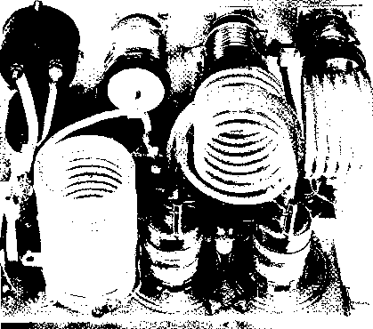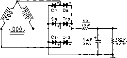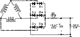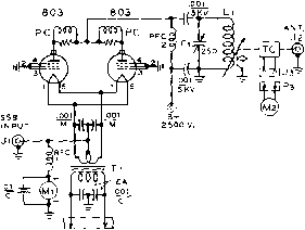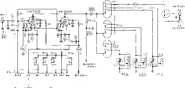 ev. D.c. o. г A {turns on with >t-S3l fils) Figure 17 WATER CIRCULATION SYSTEM FOR X-531 (4W-300B} TUBES alternator will not supply much more than 1500 watts, the primary voltage drops rapidly Tl {SEC. it I ) Tl (Pf>l.) ![]() ![]() 0-t-S25V. (SCREEN) AT 100 MA Tl (.sec. #2 ) ![]() 0-t-250ov. (plate) AT aoo MA. Figure 18 SCHEMATIC, THREE-PHASE MOBILE POWER SUPPLY D;-De-500 mo. silicon rectifier. Sorfces-Torzion M-500 D--Dj2-2.5 KV, 130 ma. rectifier stock. Sorkes-Torzian 280-SM silicon rectifier. See text for substitute Ti-Speciol three-phose power tronsformer to deliver 2500 volts d.c. at 400 mo., and 325 volts d.c. at IOO mo. Design data and core may be obtained from Arnold Engineering Co., Marengo, III. Core number: ATA-1S73 with 12-mil Hypersil laminations for 120 cvc/e operation. Primary winding: (12 volts)-focb leg, 15 turns #8e. wire ( 6 voltsj-Eoch ieg, 7 turns #5e. wire Low Voltage secondary. Each leg, 265 turns #30e. wire High Voltoge secondary: fach leg, 2400 turns #28e. wire 7.5 KY insulation employed. High voltage winding placed next to core, low voltage secondary next, and primary winding outside, with 2KY insulation. Vacuum impregnate windings. When finished, polarize windings by placing 6 volt, 50 c.p. lamps in series with each primary lead. Bulbs should only glow red when primary windings are correctly polarized. Correct polarization of secondary windinas will deliver desired output voliaaes. ![]() under overload conditions and the silicon rectifiers cannot be damaged, even with a direct short circuit across the output terminals of the high voltage power supply. This unusual equipment is described for others who may wish to make models based upon ideas presented in the design. Although some of the components shown in the amplifier or power package are unique or are not readily available, it is hoped that the reader can make use of his facilities and abilities to use many of the ideas shown herewith. Variations Upon the Basic Circuit It is possible to increase the power level of this amplifier by merely adding more tubes connected in parallel with the original two. Three tubes will permit a p.e.p. of two kilowatts at 3000 volts plate potential. ю t) * ![]() Figure 20 MULTI-BAND LINEAR AMPLIFIER FOR MOBILE SERVICE FEATURES THREE SEPARATE TANK CIRCUITS SWITCHED BY CONTROL RELAYS Three vacuum tank capacitors are located at top left corner of panel. To the right is thermocouple r.f. ammeter in output circuit. Zero-center screen meter and 0-SOQ d.c. ma. plate meter are at lower right. Figure 19 WATER COOLED LINEAR AMPLIFIER PACKAGED FOR FIXED STATION USE Either 4W-300B (water cooled) tubes or 4X-2S0B (air cooled) tubes may be employed in this compact linear amplifier. Input and output capacitors of pi-network are vacuum units, and power supply (three phase) is contained within the cabinet (right). Wide band plate r.f. choke is at left of cabinet, running from front io back. Amplifier operates at plate potential of 3000 volts, with p.e.p, of 1500 watts. Four tubes in parallel will provide a p.e.p. of two kilowatts at 2000 volts plate potential. An experimental amplifier having five tubes in parallel has run 3500 watts p.e.p. into dummy loads. The five tube amplifier employed neutralization and parasitic suppression and performed in normal fashion with no signs of instability. Shown in figure 19 is a fixed station version of this amplifier. Employing a pi-section plate tank circuit and a three-phase power supply, the complete unit is built within a standard 12 X 16 X 19 cabinet. Of unusual interest is the r-f choke employed in the plate circuit of the linear amplifier stage. This choke is usually a critical item as the full value of r-f plate potential is developed across it. For maximum amplifier efficiency and minimum loss the plate choke must present an impedance of several thousand ohms at any frequency of operation. Special r-f chokes are available that will perform this exacting task, and the one described equals the best of the commercial items at a fraction of the cost. The choke coil consists of 250 turns of #22 double cotton covered manganin wire close-wound upon a Vl-iach diameter wooden dowel rod. The small d.c. resistance of the winding effeaively destroys undesired resonance effects within the choke, providing a high and uniform impedance across all amateur bands from 80- to 10-meters. The choke will work well up to power levels of the order of 2000 watts, p.e.p., or 1000 watts, plate modulated. 29-6 A Mulfi-band Mobile Lineor Amplifier The kilowatt linear amplifier described in this section is designed for remote control mobile operation on any three amateur bands. The unit shown in the photographs operates on the 80, 40, and 20 meter bands, but operation on 15 or 10 meters is possible by altering the constants of the plate tank circuit. ![]() note *<r = screen bi-pass in tube socket 60V Bi ON* -- dSl BAND PUSH-TO TO FIL.f SWITCH -TALK POWER CIRCUIT SUPPLY Figure 21 SCHEMATIC, MULTI-BAND MOBILE LINEAR AMPLIFIER Ci, Cj, Сз-Jennings variable vacuum capacitor, type GSLA. Use 250 fiiifd. unit for 80 meters and 720 /ilifd. units for other bands. Adjust coils to resonate circuit with capacitors set near maximum value. Ll-76 turns, Y4-inch silver plated copper tubing, 2/i i.d., 3/j long. Antenna tap approximately 2 turns from ground end. Li-8 turns, same as Li. Antenna tap approximately 2 turns trom ground end. Ls-5/2 turns, same as Li. Antenna tap approximately З/4 turn from ground end. RFC-2.5 mh. National R-100 RFCl-Wide band choke, 500 ma. rating. Ray par RL-102 RY i, 3-DPOr relay, d.c. coil to match battery voffoge. Jennings type RB vacuum relay RYj-SPSr relay, d.c. coil to match battery voltage. Jennings type RB-1 vacuum relay (Jennings Radio Co., San Jose, Calif.) Ml-0 - 500 mo. d.c. meter Ml-500 - 0 - 500 d.c. micro-ammeter, zero center movement, shunted to 50 - 0 - SO ma. Мз-0 - 5 ampere, r.f. ammeter Amplifier The amplifier employs two ex-Circuit ternal a