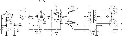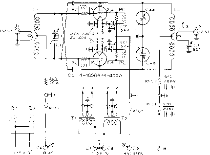NOTE: adjust SKIO VOLTaS£ to obtain specified ZERO-signal plate uurrent. 29-n A High Power Push-pull Tetrode Amplifier The push-puh tetrode amphfier stiU retains a high degree of popularity in spite of the trend towards single-ended pi-networlc amplifiers. Regardless of the power level of the push-pull amplifier, the physical design must satisfy two important requirements. First, the plate and grid circuirs of the amplifier must be symmetrical with respect to each tube; and second, the input and output circuits must be isolated from each other. Finally, after the physical layout of the amplifier has been de- ![]() © О ![]() termined, steps must be taken to eliminate all tendencies towards parasitic oscillation. Described in this section is a push-pull amplifier intended for operation in the 13-15 Mc. region. Push-pull 4-lOOOA tubes are employed, running at their maximum rated input. Other tubes, such as the 4-400A, 4-250A, or 4-125A may be substituted in the design, scaling down the various components to suitable sizes for the reduced power level. This amplifier design is suitable for use in the 3 - 30 Mc. frequency region. The lower limit of operation is restricted by the amount of tuning capacity in the grid and plate tank circuits. Padding capacitors placed across the variable tuning capacitors may be employed to reach the lower frequency portions of the HF spectrum. The upper frequency limit of operation is determined by the residual screen lead inductance of the particular tubes used in the circuit. At frequencies up to 30 Mc, no neutralizing difficulties are encountered with any of the previously mentioned tubes. Circuit The complete schematic of the Description push-pull tetrode amplifier is shown in figure 50. Grid, filament, and auxiliary metering circuits of the amplifier are enclosed beneath the chassis in an electrically tight box. All leads leaving this box are suitably filtered to prevent leakage of energy into (or out of) the enclosure. The plate circuit of the amplifier is contained in a separate enclosure above the main chassis. A small degree of feedback exists within the tetrode tubes due to the minute value of grid-plate capacity. It is therefore necessary to cross-neutralize the tubes by means of two capacitor tabs mounted near the envelope of the tube (figure 53). These capacitors are adjusted for minimum r-f feedback at the highest operating frequency of the amplifier. Any tendency towards parasitic oscillation is eliminated by the use of small parasitic chokes placed in the grid and screen leads of each tetrode tube. Excellent parasitic suppression is achieved by strapping the screen ter- Figure 49 HFGH POWER PUSH-PULL AMPLIFIER USES 4-lOOOA TUBES This amplifier design is typical of push-pull stages regardless of power level. Tubes are visible through screened openings in panel. Controls are (top to bottom): Output link tuning, variable link coupling, plate circuit tuning, and grid circuit tuning. Amplifier is housed in special 21 rack. Filament meters for each tube are on auxiliary panel holding bias and screen supply. и C2 4-ю00а/4-400а ![]() note: 1. scpee/v bypass Capacitors ARE СЁrjTRALAB TyPE ai8 Figure 50 SCHEMATIC, PUSH-PULL HIGH POWER AMPLIFIER Ci-700 - JOO lififd. butter-fly capacitor. Barker & Williamson type JCX Сг, Cj-Neutralizing capacitors. I x 3 aluminum plate mounted near tube envelope (figure S3) C,A-B-60 - 60 ii/ifd. split-stator variable vacuum capacitor. Cimac YYC-60-20. See text tor substitute С,-500 ii/ifd. Johnson S00E20 Cr,-C!,-0.7 iitd., 600 volt feedthraugli capacitor. Centralab HY-pass RFC,-VHF-type choke. National R-60, ar Ohmite Z-50 RFC2-Heavy duty plate choke. Surplus choke from AN/ART-13 transmitter, or Barker & Williamson type 800 PC-Parasitic suppressor. 3 turns #14 wire, /i-inch diam. in parallel with 47 ohm, S watt carbon Globar resistor minals of the tetrode socket together (figure 52) and inserting a parasitic choke between the screen terminal of the socket and the screen bypass capacitor. Eimac air sockets should be employed with the larger tubes, and a blast of air directed at the base seal of each tube is required. Two small 115-volt blower motors mounted on the rear of the chassis direct air streams through sections of radiator hose to the two tube sock- Figure 51 REAR VIEW OF AMPLIFIER Plate tank circuit is placet! between tetrode tubes which are mounted in air sockets. Split-stator variable vacuum capacitor is panel mounted and rotors are grounded to chassis by heavy copper strap. Tank coil is mounted on 10 ceramic insulators. Individual filament transformers tor the 4-lOOOA tubes are at rear of chassis. Each tube requires 7.5 volts at 21 amperes. Swinging link is panel driven through Millen right-angle drive unit, and flexible, braided leads connect link to antenna resonating capacitor and coaxial receptacle mounted in top screen of amplifier. Dual blower motor is mounted to rear of chassis. All power leads (including filament leads to meters) are brought out through bulkhead-type capacitors. ![]() ![]() ets. It is necessary to ground the metal base ring of each tube to the chassis, since this ring forms part of the scteen shielding circuit. If grounding clips are not furnished with the tube socket, they may be made from a short length of ys-inch wide brass strap formed to spring against the base ring. Excellent circuit symmetry is achieved by the use of butter-fly -type tuning capacitors in the grid and plate circuits. A 100-watt plug-in coil may be employed in the grid circuit, while heavy-duty plug-in coils will suffice in the plate circuit up to the kilowatt level. If extremely high plate voltage is to be used, the Eimac dual vacuum variable capacitor (VVC-60-20) should be employed to prevent flash-over. The less expensive Barker & Williamson butter-fly capacitor may be employed for plate voltages of 3500 or less. ![]() Figure 53 CLOSE-UP OF PLATE CHOKE AND NEUTRALIZING CAPACITOR Neuiralmng capacitor is