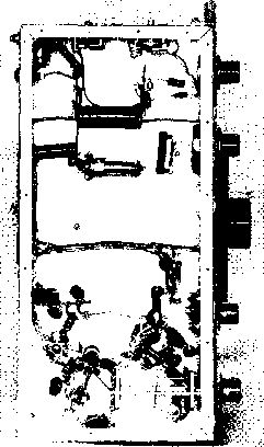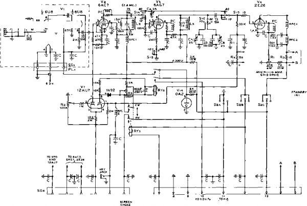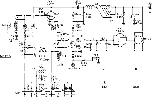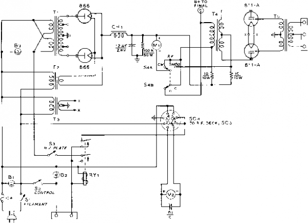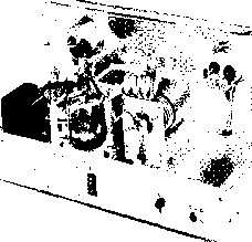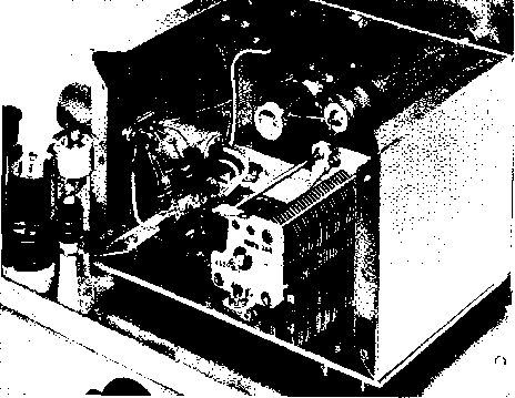 Главная » Журналы » Simple coaxial reflectometer 1 ... 64 65 66 67 68 69 70 ... 80 SPEECH AMPLIFIER ![]() EXTERNAL 15 V.RELAY CONTROL Figure 10 SCHEMATIC, POWER SUPPLY AND MODULATOR DECK 7,-7775/7500 each side ct.. 625 mo., ICAS. 7 75/230 volt primary. Stancor P-8029 Гг-2.5 v., 70 a.. 10KV insulation. Stancor P-3060 Ts-6.3 v., 70 a. Stancor P-6308 -300 wott polypedance modulation transformer. Stancor Л-3898. Primary impedance 12K, secondary impedance 6K Ts- Polypedance driver transformer. Stancor Л-4762 RYi-DPDT relay, 70 ampere contacts, 7 75 v. a.c. coil Mi-0 - 500 mo. /Лг-0 - 700 mo. SiA-B-2 pole, 3 position high voltage switch. (Found in war surplus BC-306A antenna tuning unit), or equivalent CHi-500 mo. swinging cTiolce, 2-76 h. Stancor C-140S Bi-2-з-175 volt pilot lamps SOi-8 prong octal socket movable shorting bar are mounted at the B-plus end of the assembly. The rotor of the butter-fly capacitor is left floating and is panel driven through a high voltage shaft coupling. The neutralizing capacitors (Gi, GO are mounted on a triangular piece of polystyrene or other good insulating material and placed between the tube sockets. Construction of these capacitors is shown in figure 13. The 144 Mc. antenna link coil is a U-shaped pickup loop mounted beneath the linear tank circuit, while the 50 Mc. pickup coil is inserted between the turns of plate coil Lis. The single turn neutralizing coil Lu is placed near one end of Lis as shown in the photograph. Placement of the major components beneath the chassis may be seen in figure 6. The linear tank circuit LaA-B runs in zig-zag fashion from the plate terminals of the buffer tube Vs to two ceramic standoff insulators mounted on the bottom plate of the power amplifier enclosure. Spacing between the lines is held constant, and they are supported at the buffer end on two 1 ceramic insulators. The buffer tuning capacitor Ст is mounted to the chassis between the lines and panel driven with a phenolic shaft. The rotor of this capacitor is not grounded. The stators of Ci are connected to the lines with short lengths of flexible s.trap. Any grid current unbalance in the final amplifier stage can be corrected by varying the FIGURE 12 COIL CHART FOR 50-144 MC. TRANSMITTER Ll MC. COIL ) 36 T.#24 E., 1/2 DIA. MILLEN 690a6 FORM. l2-i50 MC. COIL ) 28T. 24E., I/2 DIA. MILLEN 69046 PORM. l3- 52 TURNS ге E. MILLEN 69046 FORM. La-2.ZT. CENTERTAP, 3/4 01 A., 32T.P.i. BiW iOli L5-15t. CENTER TAP, 1/2 DIA., 16T,p.l, BtW iOO LINK COIL: ONE TURN HOOKUP WIRE. Le- 2 1/2 T. CENTER TAP. 1/2 DIA. 16 T.P. i . BiW 3003 LINK coil; ONE TURN HOOKUP WIRE. l7- 7 T. CENTER TAP. Ъ/й' DIA 1вТ.Р BiW 3007 LINK coil: one TURN HOOKUP WIRE, l.i-{S0MC.) 7T, CENTER TAP, 3/4 DIA., в T.P. i. BSW 3010 LINK COIL : ONE TURN HOOKUP WIRE. t,144MC.)3 1/4X.02-X ,125 C0P.STRAP ВЫ1 U.iSEE FIS.7) LINK: 1 TURN HOOKUP WIRE BENT TO FIT La. L9A-B- n e COPPER WIRE, OR ,125 DIA, ROD, PLUS 3 OF 1/2 WIDE FLEXIBLE COPPER STRAP (eRWLEAO) PLUS 3/4 FLEXIBLE COPPER STRAP (PLATE LEAD ). ADJUST SPACING FOR RESONANCE, fff FIS. s FOP LAYOUT) LlO-ST., S/eDIA.,* ME. WIRE. ADJUST SPACING OF TURNS FOR RESONANCE AT 50 MC. WITH C7 AT FULL CAPACITY, LllA-B- 10 OF 1/в Х 1 1/a ALUMINUM STRAP, SPACED 3 3/8 CENTER TO CENTER, SHORTING BAR MADE OF SAME MATERIAL, ATTACHED 6 7/8 FROM PLATE END TO CENTER OF BAR. PLATE PIN RECEPTACLES REMOVED FROM SOCKET AND ATTACHED TO ENDS of LINES (SEE FISUPE 5 ) SOMC. COIL) 6 Т., 1 1/4 Dia. 6 COPPER WIRE, OR .125 TUBING. SPACE TURNS TO RESONATE TO 50 MC. WITH CSNEAR FULL CAPACITY. Ll3-19 CF#12E.W1RE BENT TO U SHAPE TO FORM 5 X 2 LOOP WITH 3 1/2 LEADS. PLACE UNDER Ll1 A-B. L14-1TURN, 2 DIA., 10 KV HOOKUP WIRE, Ll5-1 TURN, 1/2 DIA. 16E WITH INSULATED SLE EV ING. PLACE AT CENTER DF LlO. Lie-2 TURNS, 1 1/4 DIA lOKV HOOKUPWIRE. 6-32 bolt position of tlie taps on the lines until balanced current is obtained. The tuning range of the capacitor on 144 Mc. is reduced by moving the taps closer to the electrical center of the line. An L -shaped shield plate passes around the edge of tripler capacitor C4-C5 to shield the low power stages from the buffer plate lines. The under-chassis shielding is completed when a bottom plate is bolted to the chassis. The power supply section occupies the rear portion of the chassis. High vokage rectifiers Di-2-3-4 are mounted above the deck (figure 4) and the diodes of the bias supply are mounted below the chassis. Figure 9 shows the interior of the VFO compartment. The two oscillator coils are mounted on the side of the box, across from the four crystal sockets. The trimmer capacitors are mounted above their respective coils. The grid and cathode leads to oscillator tube Vi pass through a large rubber grommet mounted in the bottom of the enclosure. The Power and Moduiotar Deck The power supply is mounted upon a steel chassis measuring 13 x COPPER STRAP LEAD TO PLATE COPPER STRAP LEAD TO GRID poltstyrene sheet chassj5 6-32 BOLT A- 3/8 X 2- CERAMIC INSULATOR, TAPPED AT EACH END FOR e-32 MACHINE SCREWS, B,C-1 1/6 DIA, BRASS DISC WITH 3/6 CLEARANCE HOLE FOR CERAMIC INSULATOR, LOWER DISC SUPPORTED ON 3/6 CERAMIC INSULATORS. USE FLAT HEAD SCREWS. D- 3/6 CERAMIC INSULATORS, E- 1 1/6 DISC MADE OF TWO LAYERS OF ,015 THICK TEFLON HELD ATOP С BY CELLOPHANE TAPE. F- TWO 6/32 NUTS PLACED UNDER STRAP, STRAP AND NUTS SOLDERED TO BRASS PLATE. HOLE in PLATE PASSES e/32 BOLT. Figure 13 CONSTRUCTION OF NEUTRALIZING CAPACITOR FOR 826 STAGE Two capacitors are required (Cn and Си). Capacitors tiave top brace plate made of polystyrene sheet or other good VHF insulating material, Plate is supported on two ceramic insulators which form center support for capacitors. Plates of neutralizing capacitors are made of brass discs. The grid disc is supported on short ceramic insulators, and the plate disc is supported trom the polystyrene plate by 6-32 machine screw. Plate encircles ceramic insulator with a close fit. Plate lead and two 6-32 nuts are soldered to t
