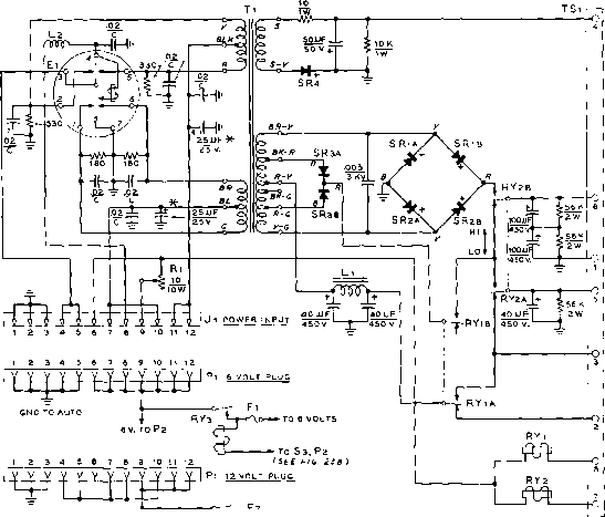 Главная » Журналы » Simple coaxial reflectometer 1 ... 67 68 69 70 71 72 73 ... 80 ![]() -25 V BIAS 450/300 V, TRANSMIT. + 300V TRANSMIT. + 250 V, TRANSMIT. + 250 V, R ECEIVER GND TO AUTO 12V.T0 Рг R y3 *-J-<a>- To 12 VOLTS To s3, Рг (SEE FIG. 23S) TO Sl TO s2 NOTES 1- RELAYS SHOWN IN UNENERGIZED POSITION. i.-ALL RESISTORS 7 WATT UNLESS OTHERWISE NOTED. -MOUNT AT TRANSFORMER TERMINAL. Figure 20 SCHEMATIC, 6-12 VOLT MOBILE SUPPLY Cl-Vibrator, dual interrupter, split-reed; 6 volt coils, 7I6,c.p.s. reed frequency, 7 pin base. Mallory type 7707, Oak V-6853, Radiart 5722, or G.B. A-7141 S84-Pf. Fl-30 ampere cartridge fuse. Fl-75 ampere cartridge fuse. Jl-12 pin male chassis plug. CJnch-Jones Р-3 72-ЛВ Pj-72 pin female cable socfcet. Cinch-Jones 5-ЗГ2-ССТ L,-7.5 henry, JOO ma. Siancor C-1421 1-2-7 цЬ., 1 amp. Ohmite 2-50 r-f choice RYi, RYi-D.p.d.t. relay, 6 volt coil. Advance MG/2c/6VD, Potter & Brumfield MR-11D-6V, Guardian 200-6D Coil and 200-2 assembly, or Ohmite 005Х-75вГ, or equiv. SR SRi-rwo section selenium rectifier, 150 ma., 380 volts peak inverse per section, connected for doubler service. G.B. A-7144141-P2, or two Federal 100S-A rectifiers in series for each leg (8 in all). SRs-rwo section selenium rectifier, 150 ma., 380 volts peak inverse per section, connected for center-tap service, G.E. A-7144141-P1, or two Federal 100S-A rectifiers with red terminals connected together. SRi-750 ma., 64 volt peak inverse selenium rectifier. G. C. A-7140806-P1 or Federal 1075. Tl-Vibrator-type power transformer. Dual center-tapped 6 volt primaries. Secondaries: 420 volts c.t. with 750 volt tops, 300 ma., and 20 volt, 150 ma. bias voltage winding. G.E. B-7486449-P1. TS,-8 terminal barrier strip. Cinch-Jones 8-141-Y. Note; General Electric parts may be ordered from: D. S. Clark, G.E. Ca., Product Service Renewal Parts Section of Communication Products, 509 Kent St., tltico, N.Y. Current prices plus shipping charges ore: Tj, 574.70; 55.75; SRi, SRj, SR 57.75 each; SRj, 51.40. inch thick aluminum is cut as shown in figures 21 and 22. A cut-out in one corner is necessary to clear the lower portion of the power transformer. All chassis drilhng and the cutouts for the power transformer, power input plug, and output terminal strip should be completed before the chassis is permanent- ly fastened in place with small aluminum angle brackets, two inches from the bottom of the box. One electrolytic capacitor, Ci, is mounted on an insulated plate furnished with the capacitor. When twisting the locking lugs, make sure that they do not come near the metal ![]() Figure 21 UNDER-CHASSIS VIEW OF POWER SUPPLY The vibrator socket is hidden by the resistors and disc ceraitiic capacitors of the hash filter. R-f choke Lt and the 25 /ltd. capacitors are above these parts on the wall of the case. Resistor Rl is nmunted to the wall, with SRi, SR;, and SRs in line below it. chassis. The can of this capacitor is more than 200 volts above ground and should be insulated with a fibre sleeve. The large seven pin socket into which the vibrator plugs should have two soldering lugs placed under each mounting bolt for the bypass capacitors which are later wired to the socket pins. If the power supply is to be mounted with the chassis in a vertical plane, pins 1 and 4 of the vibrator socket should be in a vertical plane. The smaller components below the chassis should not be installed until parts above the chassis have been assembled and wired. The transformer primary leads are wired to the input plug and vibrator socket with shortest possible leads before other parts are wired. Placement of the under-chassis parts may be seen in figure 21. Layout of the parts is not critical. Testing the After the wiring has been Supply checked, the power supply should be checked at half input voltage, but with full voltage applied to the vibrator coil. This is done by temporarily removing the jumper between pins 7 and 8 on the twelve volt power plug. Pi. Pin 8 is then Figure 22 TOP VIEW OF POWER SUPPLY INTERIOR Relays RY, and RYi are at center above chofce Li. Power transformer Ti is mounted on end of cabinet. Across top ot chassis (left to right) are vibrator and filter capacitors ![]() FROM BATTERV I POWER RELAV AND FUSE 3 WIRE CABLE e v.- B 12 V. - * 1 г 4WIRE CABLE, TO RECEIVER г WIRE CABLE * e FOR e V. 10 FOR 12 V-