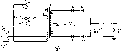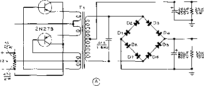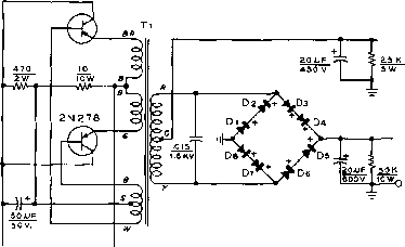20JJF -О-Н 27S V. gSKf AT 125 MA, 1 -o- 6- 12V. BATTERY +6 HANDBOOK Components 707 at 50 milliamperes, simultaneously). Both power units operate from a 12 volt primary source. The 35 Watt The 35 watt power unit uses Supply two inexpensive RCA 2N301A P-N-P-type power transistors for the switching elements and four silicon diodes for the high voltage rectifiers. The complete schematic is shown in figure 29. Because of the relatively high switching frequency only a single 20 /nfd. filter capacitor is required to provide pure d.c. Regulation of the supply is remarkably good. No load voltage is 310 volts, dropping to 275 volts at maximum current drain of 125 milliamperes. The complete power package is built upon an aluminum chassis-box measuring 5V4 x 3 x2 . Paint is removed from the center portion of the box to form a simple heat sink for the transistors. The box therefore conducts heat away from the collector elements of the transistors. The collector of the transistor is the metal case terminal and in this circuit is returned to the negative terminal of the primary supply. If the negative of the automobile battery is grounded to the frame of the car the case of the transistor may be directly grounded to the unpainted area of the chassis. If the positive terminal of the car battery is grounded it is necessary to electrically insulate the transistor from the aluminum chassis, yet at the same time permit a low thermal barrier to exist between the transistor case and the power supply chassis. A simple method of accomplishing this is to insert a thin mica sheet between the transistor and the chassis. Two Mil (0.002 ) mica washers for transistors are available at many large radio supply houses. The mica is placed between the transistor and the chassis deck, and fibre washers are placed under the retaining nuts holding the transistor in place. When the transistors are mounted in place, measure the collector to ground resistance with an ohmmeter. It should be 100 megohms or higher in dry air. After the mounting is completed, spray the transistor and the bare chassis section with plastic Krylon to retard oxidation.. Several manufacturers produce anodized aluminum washers that serve as mounting insulators. These may be used in place of the mica washers, if desired. The under-chassis wiring of the supply may be seen in figure 30. The 85 Wott Figure 31 shows the schematic Supply of a dual voltage transistorized mobile power supply. A bridge ![]() ![]() Figure 30 UNDER-CHASSIS LAYOUT OF PARTS Two ?0 titd. capacitors are connected in parailel for 20 tifd. output filter capacitor. Silicon rectifiers are mounted in dual fuse clips at end of chassis. Transistors are insulated from chassis with thin mico sheets and fibre washers if suppl)r is used with positive-grounded primary system. rectifier permits the choice of either 250 volts or 500 volts, or a combination of both at a total current drain that limits the secondary power to 85 watts. Thus, 500 volts at 170 milliamperes may be drawn, with correspondingly less current as additional power is drawn from the 250 volt tap. The supply is built upon an aluminum box-chassis measuring 7 x5 x3 , the layout closely following that of the 35 watt supply. Delco 2N278 P-N-P-type transistors are used as the switching elements and eight silicon diodes form the high voltage bridge rectifier. The transistors are affixed to the chassis in the same manner as the 2N301A mounting described previously. 32-8 Power Supply Components The usual components which make up a power supply, in addition to rectifiers which have already been discussed, are filter capacitors, bleeder resistors, transformers, and chokes. These components normally will be purchased especially for the intended application, taking into consideration the factors discussed earher in this chapter. Filter Copocitors There are two types of filter capacitors: (1) paper dielectric type, (2) electrolytic type. Paper capacitors consist of two strips of metal foil separated by several layers of special 2N278 ![]() 0+250 V, o+SOOV. Figure 31 SCHEMATIC, 85 WATT TRANSISTOR POWER SUPPLY FOR 12 VOLT AUTOMOTIVE SYSTEM Ti-Transistor power transformer. 12 volt primary to provide 275 volts at 125 ma. Chicago Standard DCT-2. Di-Di-Sarlces-Tarzian silicon rectifier, type M-SOO 6- 12 V. BATTERY +0 paper. Some types of paper capacitors are wax-impregnated, but the better ones, especially the high-voltage types, are oil-impregnated and oil-filled. Some capacitors are rated both for flash test and normal operating voltages; the latter is the important rating and is the maximum voltage which the capacitor should be required to withstand in service. The capacitor across the rectifier circuit in a capaciror-input filter should have a ivo -king voltage rating equal at least to 1.41 times the r-m-s voltage output of the rectifier. The remaining capacitors may be rated more nearly in accordance with the d-c voltage. The electrolytic capacitor consists of two aluminum electrodes in contact with a conducting paste or liquid which acts as an electrolyte. A very thin film of oxide is formed on the surface of one electrode, called the anode. This film of oxide acts as the dielectric. The electrolytic capacitor must be correctly connected in the circuit so that the anode always is at a positive potential with respect to the electrolyte, the latter actually serving as the other electrode (plate) of the capacitor. A reversal of the polarity for any length of time will ruin the capacitor. The dry type of electrolytic capacitor uses an electrolyte in the form of paste. The dielectric in electrolytic capacitors is not perfect; these capacitors have a much higher direct current leakage than the paper type. The high capacitance of electrolytic capacitors results from the thinness of the film which is formed on the plates. The maximum voltage that can be safely impressed across the average electrolytic filter capacitor is between 450 and 600 volts; t