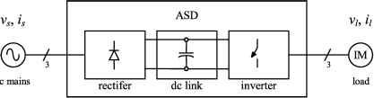 ![]() FIGURE 14.1 A standard adjustable speed drive scheme and associated waveforms: (a) the electrical power conversion topology; (b) the ideal input (ac mains) and output (load) waveforms; and (c) the actual input (ac mains) and output (load) waveforms. waveform (Fig. 14.1c). Although this waveform is not sinusoidal as expected (Fig. 14.1b), its fundamental component behaves as such. This behavior should be ensured by a modulating technique that controls the amount of time and the sequence used to switch the power valves on and off. The modulating techniques most used are the carrier-based technique (e.g., sinusoidal pulsewidth modulation, SPWM), the space-vector (SV) technique, and the selective-harmonic-elimination (SHE) technique. The discrete shape of the ac output waveforms generated by these topologies imposes basic restrictions on the applications of inverters. The VSI generates an ac output voltage waveform composed of discrete values (high dv/dt); therefore, the load should be inductive at the harmonic frequencies in order to produce a smooth current waveform. A capacitive load in the VSIs wiU generate large current spikes. If this is the case, an inductive filter between the VSI ac side and the load should be used. On the other hand, the CSI generates an ac output current waveform composed of discrete values (high di/dt); therefore, the load should be capacitive at the harmonic frequencies in order to produce a smooth voltage waveform. An inductive load in CSIs will generate large voltage spikes. If this is the case, a capacitive filter between the CSI ac side and the load should be used. A three-level voltage waveform is not recommended for medium-voltage ASDs due to the high dv/dt that would apply to the motor terminals. Several negative side effects of this approach have been reported (bearing and isolation problems). As alternatives to improve the ac output waveforms in VSIs are the multistage topologies (multilevel and multiceU). The basic principle is to construct the required ac output waveform from various voltage levels, which achieves medium-voltage waveforms at reduced dv/dt. Although these topologies are weU developed in ASDs, they are also suitable for static var compensators, active filters, and voltage compensators. Specialized modulating techniques have been developed to switch the higher number of power valves involved in these topologies. Among others, the carrier-based (SPWM) and SV-based techniques have been naturally extended to these applications. In many apphcations, it is required to take energy from the ac side of the inverter and send it back into the dc side. For instance, whenever ASDs need to either brake or slow down the motor speed, the kinetic energy is sent into the voltage dc link (Fig. 14.1a). This is known as the regenerative mode operation and, in contrast to the motoring mode, the dc link current direction is reversed due to the fact that the dc link voltage is fixed. If a capacitor is used to maintain the dc link voltage (as in standard ASDs) the energy must either be dissipated or fed back into the distribution system, otherwise, the dc hnk voltage gradually increases. The first approach requires the dc link capacitor be connected in parallel with a resistor, which must be properly switched only when the energy flows from the motor load into the dc hnk. A better alternative is to feed back such energy into the distribution system. However, this alternative requires a reversible-current topology connected between the distribution system and the dc hnk capacitor. A modern approach to such a requirement is to use the active front-end rectifier technologies, where the regeneration mode is a natural operating mode of the system. In this chapter, single and three-phase inverters in their voltage and current source alternatives will be reviewed. The dc link wiU be assumed to be a perfect dc, either voltage or current source that could be fixed as the dc link voltage in standard ASDs, or variable as the dc hnk current in some medium-voltage current source drives. Specifically, the topologies, modulating techniques, and control aspects, oriented to standard applications, are analyzed. In order to simplif) the analysis, the inverters are considered lossless topologies, which are composed of ideal power valves. Nevertheless, some practical nonideal conditions are also considered. 14.2 Single-Phase Voltage Source Inverters Single-phase voltage source inverters (VSls) can be found as half-bridge and full-bridge topologies. Although the power range they cover is the low one, they are widely used in power supphes, single-phase UPSs, and currently to form elaborate high-power static power topologies, such as for instance, the multicell configurations that are reviewed in Section 14.7. The main features of both approaches are reviewed and presented in the foUowing. 14.2.1 Half-Bridge VSI Figure 14.2 shows the power topology of a half-bridge VSI, where two large capacitors are required to provide a neutral point N, such that each capacitor maintains a constant voltage Vi/2. Because the current harmonics injected by the operation of the inverter are low-order harmonics, a set of large capacitors (C and C ) is required. It is clear that both switches and S cannot be on simultaneously because a short circuit across the dc link voltage source would be produced. There are two defined (states 1 and 2) and one undefined (state 3) switch state as shown in Table 14.1. In order to avoid the short circuit across the dc bus and the undefined ac output voltage condition, the modulating technique should always enure that at any instant either the top or the bottom switch of the inverter leg is on. TABLE 14.1 Switch states for a half-bridge single-phase VSI State State # Components Conducting