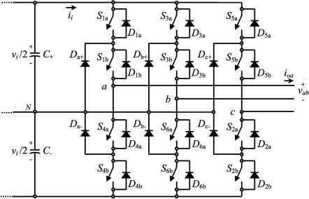 I it 11 11 I 11 I I I tt I I I I I 11 > ¥ 1 5 9 13 17 21 29 33 37 41 45 49 < (f) overaU current spectrum. tance) smoothes out the edges of the current, which also contributes to the reactive power required by the cells. This last effect is not shown in Fig. 14.56a,b and c. 14.7.2 Multilevel Topologies The six-switch VSI is usually caUed a two-level VSI due to the fact that the inverter phase voltages v, Vy, and v (Fig. 14.52a) are instantaneously either vjl or -vjl. In other words, the phase voltages can take one of two voltage levels. Multilevel topologies provide an alternative to these voltages to take one value out of N levels. For instance. Fig. 14.57 shows an iV = 3-level topology, where the values of the inverter phase voltage are either vJ2, 0, or -vJ2 (Fig. 14.58d). An interesting problem is how to obtain the gating pattern for the 12 switches required in an iV = 3-level topology. There are several modulating techniques to overcome this problem, which can be classified as analog (e.g., carrier-based) and digital (space-vector-based). Both approaches have to deal with the valid switch states of the inverter. 14.7.2.1 Valid Switch States in a Three-Level VSI The easiest way of obtaining the valid switch states is to analyze each phase separately. Phase a contains the switches la ib 4a 4b which cauuot be on simultaneously because a short circuit across the dc bus would be produced, and cannot be off simultaneously because an undefined phase voltage v would be produced. A summary of the valid switch combinations is given in Table 14.7. It is important to note that all vahd switch combinations satisfy the condition that switch state is always the opposite to switch state, and that switch S state is always the opposite to switch S413 state. TABLE 14.7 Valid switch states for a three-level VSI, phase a