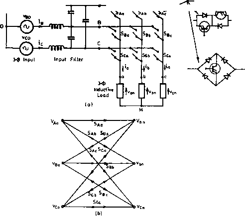 cos(3(jOit) cos(3a;t) cos(3a;t) cos(3a;,t) cos(3a;t) cos(3a;t) (16.36) where V and V are the magnitudes of output and input fundamental voltages of angular frequencies cOq and respectively. With V < 0.866 V-, a general formula for the duty cycles mij(t) is derived in Reference [29]. For unity IDF condition, a simplified formula is 1 +2cos(a;,t-20- 1)60°) cos(a;,t-2(i- 1)60°) -cos(3a;,t) - -cos(3a;t) 2л/3 6 . [cos(4(Dit-2(j- 1)60°) - cos(2a;,t - 2(1 -;)60°] (16.37) where i, j = 1, 2, 3 and q = Vomlim The method developed as in the preceding is based on a Direct Transfer Function (DTF) approach using a single modulation matrix for the matrix converter, employing the switching combinations of all three groups in Table 16.1. Another approach caUed Indirect Transfer Function (ITF) approach [23, 24] considers the matrix converter as a combination of PWM voltage source rectifier-PWM voltage source inverter (VSR-VSI) and employs the already weU-estabhshed VSR and VSI PWM techniques for MC control utilizing the switching combinations of Group II and Group III only of Table 16.1. The drawback of this approach is that the IDF is limited to unity and the method also generates higher and fractional harmonic components in the input and the output waveforms. SVM Method, The space vector modulation is now a weU-documented inverter PWM control technique that yields high voltage gain and less harmonic distortion compared to the other modulation techniques as discussed in Chapter 14, Section 14.6. Fiere, the three-phase input currents and output voltages are represented as space vectors and SVM is apphed simultaneously to the output voltage and input current space vectors. Applications of the SVM algorithm to control of matrix converters have appeared in the literature [27-30] and shown to have inherent capability to achieve full control of the instantaneous output voltage vector and the instantaneous current displacement angle even under supply voltage disturbances. The algorithm is based on the concept that the MC output line voltages for each switching combination can be represented as a voltage space vector defined by Vo=- Kb + bc exp( ;120°) + v exp(-;120°)] (16.38) Of the three groups in Table 16.1, only the switching combinations of Group II and Group III are employed for the SVM method. Group II consists of switching state voltage vectors having constant angular positions and are caUed active or stationary vectors. Each subgroup of Group II determines the position of the resuhing output voltage space vector, and the six state space voltage vectors form a six-sextant hexagon used to synthesize the desired output voltage vector. Group III comprises the zero vectors positioned at the center of the output voltage hexagon and these are suitably combined with the active vectors for the output voltage synthesis. The modulation method involves selection of the vectors and their on-time computation. At each sampling period T, the algorithm selects four active vectors related to any possible combinations of output voltage and input current sectors in addition to the zero vector to construct a desired reference voltage. The amplitude and the phase angle of the reference voltage vector are calculated and the desired phase angle of the input current vector are determined in advance. For computation of the on-time periods of the chosen vectors, these are combined into two sets leading to two new vectors adjacent to the reference voltage vector in the sextant and having the same direction as the reference voltage vector. Applying the standard SVM theory, the general formulas derived for the vector on- times, which satisfy, at the same time, the reference output vohage and input current displacement angle in Reference [29], are to = a/3C0S( a/3C0S( а/З COS ( -sin(6O°-0 )sin(6O°-0,) -sin(60° - 0,)sin0 -sin0 sin(60° -0;) - sin sin 0; (16.39) cos ( where ({ = voltage transfer ratio, is the input displacement angle chosen to achieve the desired input power factor (with ф- = 0, a maximum value of = 0.866 is obtained), 9 and are the phase displacement angles of the output voltage and input current vectors, respectively, whose values are limited within the 0-60° range. The on-time of the zero vector is (16.40) The integral value of the reference vector is calculated over one sample time interval as the sum of the products of the two adjacent vectors and their on-time ratios. The process is repeated at every sample instant. Control Implementation and Comparison of the Two Methods. Both methods need a Digital Signal Processor (DSP)-based system for their implementation. In one scheme [29] for the Venturini method, the programmable timers, as available, are used to time out the PWM gating signals. The processor calculates the six switch duty cycles in each sampling interval, converts them to integer counts, and stores them in the memory for the next sampling period. In the SVM method, an EPROM is used to store the selected sets of active and zero vectors and the DSP calculates the on-times of the vectors. Then with an identical procedure as in the other method, the timers are loaded with the vector on-times to generate PWM waveforms through suitable output ports. The total computation time of the DSP for the SVM method has been found to be much less than that of the Venturini method. Comparison of the two schemes shows that while in the SVM method the switching losses are lower, the Venturini method shows better performance in terms of input current and output voltage harmonics 16.5.2 Commutation and Protection Issues in a Matrix Converter As the matrix converter has no dc link energy storage, any disturbance in the input supply voltage will affect the output voltage immediately and a proper protection mechanism has to be incorporated, particularly against overvoltage from the supply and overcurrent in the load side. As mentioned, two types of bidirectional switch configurations have hitherto been used - one,