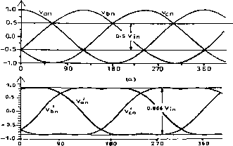 adopting a suitable switching strategy. However, it has been shown [22, 31] that regardless of the switching strategy there are physical limits on the achievable output voltage with these converters as the maximum peak-to-peak output voltage cannot be greater than the minimum voltage difference between two phases of the input. To have complete control of the synthesized output voltage, the envelope of the three-phase reference or target voltages must be fully contained within the continuous envelope of the three-phase input voltages. Initial strategy with the output frequency voltages as references reported the limit as 0.5 of the input as shown in Fig. 16 32a. This can be increased to 0.866 by adding a third harmonic voltage of input frequency (Vj/4) cos3a;t to aU target output voltages and subtracting from them a third harmonic voltage of output frequency (V/6) cos 3a;t as shown in Fig. 16.32b [22, 31]. However, this process involves a considerable amount of additional computations in synthesizing the output voltages. The other alternative is to use the space vector modulation (SVM) strategy as used in PWM inverters without adding third harmonic components but it also yields the maximum voltage transfer ratio as 0.866. An ac input LC filter is used to eliminate the switching ripples generated in the converter and the load is assumed to be sufficiently inductive to maintain continuity of the output currents. connected, the voltages v, v, v at the output terminals are related to the input voltages Уд, V, Vo 16.5.1 Operation and Control Methods of the Matrix Converter The converter in Fig. 16.31 connects any input phase (A, B, and C) to any output phase (a, b, and c) at any instant. When ![]() FIGURE 16.32 Output voltage limits for three-phase ac-ac matrix converter: (a) basic converter input voltages; (b) maximum attainable with inclusion of third harmonic voltages of input and output frequency to the target voltages.