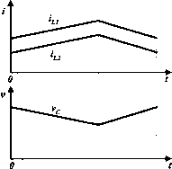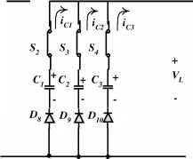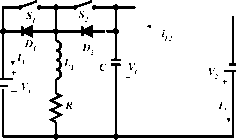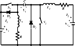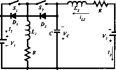 (i) Switch-on: S2, S4, S6 & S8 on (ii) Switch -off: SI, S4(S5) & S7 on (iii) Waveforms. FIGURE 17.45b Mode A2 (quadrant I): forward motoring with < V2. The average current 2VC-V2 ic(t)dt C2-S7-C1, and the voltage across capacitors Q and C2 is decreasing. Capacitors Q and C2 transfer the energy from the load to the source. Therefore, we have I2 = 21. The average capacitor voltage is ic(t)dt Vc = 0.5v2 + Vi 2.5 = 11.2 The average current The transfer efficiency is A2 = IT = l-kV22Vr-V2 V, к V,V,- Vc 2V, 2Vc - V, ic(t)dt (l-k) For Mode Bl, condition V > V2 is shown in Fig. 17.45c. Because Vi> V2, two capacitors Q and C2 are connected in parallel during switch-on and in series during switch-off. The voltage-lift technique is applied. During the switch-on state, switches S2, S4, and Sg are closed. In this case capacitors j transfer efficienc i C1 C2 are charged via the circuit V2-S2-C1 C2-S, and the voltage across capacitors Q and C2 is increasing. During the switch-off state, switches S, S4 and S7 are closed. In this case capacitors Q and C2 are discharged via the circuit 51-1-54- ic(t)dt к l-kV2Vc-V У1 Pi к V2V2- Vc S2 -O-D- S5 C2 S7 C1 S8 -o-о ==Vci S2 S6 V1 V2 ssJJ S1 o-On ==Vci (i) Switch-on: S2, S4, S6 & S8 on (ii) Switch -off: SI, S4(S5) & S7 on