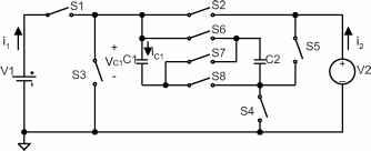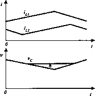 Each mode has two conditions: > and < v2 (or iv2i for Qjjj and Qiv)- Each condition has two states: on and off. Usually, each state is operating in a different conduction duty к for different currents. As usual, the efficiency of all switched-capacitor dc/dc converters is independent of the conduction duty cycle k. The switching period is T, where T = 1 . The switch status is shown in Table 17.3. As usual, the transfer efficiency rehes only on the ratio of the source and load voltages, and it is independent of R, C, f and k. We select /с = 0.5 for our description. Other values for the reference are / = 5kFLz, Y = 21V and Y = 14 V, and total С = 4000 F, R = 50 mQ. For Mode Al, condition Y > Y is shown in Fig. 17.45a. Because V > two capacitors Q and C are connected in parallel. During the switch-on state, switches S, S4, S and Sg are closed and other switches are open. In this case capacitors Cy C2 are charged via the circuit v1-s1-Q c2-S4, and the voltage across capacitors Q and c2 is increasing. During the switch-off state, switches s2, S4, S and Sg are closed and other switches are open. In this case capacitors Q c2 are discharged via the circuit s2-v2-4-Q Q and the voltage across capacitors Q and c2 is decreasing. Capacitors Q and c2 transfer the energy from the source to the load. Yc = kY+{l-k)Y2 The average current Vc-Ъ icit)dt (l-k) ic(t)dt к Ух-Ус R The transfer efficiency is Po \-kV,Vc-V, V, For Mode A2, condition Y < Y is shown in Fig. 17.45b. Because V < V25 two capacitors Q and C are connected in parallel during switch-on and in series during switch-off. This is the so-called voltage-lift technique. During the switch-on state, switches S, S4, S and Sg are closed and other switches are open. In this case capacitors c1 c2 are charged via the circuit v1-s1-Q c2-S4, and the voltage across capacitors Q and c2 is increasing. During the switch-off state, switches s2, S4 and S7 are closed and other switches are open. In this case capacitors Q and C are discharged via the circuit s2-v2-4-c1-S7-c2, and the voltage across capacitor Q and C is decreasing. Capacitors Q and C transfer the energy from the source to the load. The average capacitor voltage is Vc = =XX.l S1 1-0-Q- vcii= S2 S6 C1 S7 C2 S5 S2 -O-D- Vci -r - - C2 S5 (i) Switch-on: SI, S4, S6 & S8 on (ii) Switch-off: S2, S4, S6 & S8 on (iii) Waveforms FIGURE 17.45a Mode Al (quadrant I): forward motoring with > f2. TABLE 17.3 Switch status (none of the mentioned switches are open) The average capacitor vohage, S2 -O-D- S6 O-D- tO-D-S7 C1, S8 -O-D- S2 S6 i=vci V1 V2 V1 i,