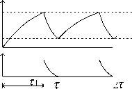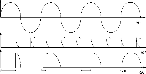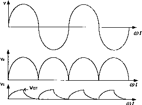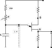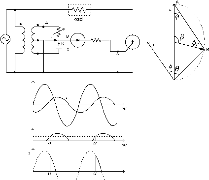 FIGURE 18.9 A Diac RC trigger circuit used in ac regulators. example 18.4. If the RC branch of Example 18.3 (Fig. 18.6) is used in a Diac trigger circuit (with Yq = 30 V), what are the minimum and maximum firings or switching angle a? Solution. Equation (18.18) for Vq holds good even for this case. However, here, triggering takes place at Vc((ot) = Vcioc) = Vjq = 30 V instead of Vt = 2 V. Now, the value of Vc((Dt) can be computed for cot = 0 to 180° by the direct substitution method as was done for the previous case. A simple computer program in QBASIC is given in what foUows for Diac trigger circuits to find the required value of a. It corresponds to the condition when Vq becomes equal to Vq. REM Program for switching angle. Alpha in Diac trigger circuit PRINT Program developed by Jamil Asghar, EED,AMU,Aligarh, India PRINT Give: R in K-Ohm, С in uF, VBO of Diac, Supply Voltage INPUT R, C, VBO, V pi = 4 * ATN(l) phi = ATNdOOO / (2 pi * 50 R C) ) Vm = SQR(2) * V phid = phi * 180 / pi FOR wtd = 0 TO 180 STEP 0.1 phi = pi * phid / 180 wt = pi * wtd / 180 vRl = SIN(wt + phi) - SIN(phi) * EXP(-wt TAN(phi)) vR = Vm * vRl * COS(phi) vC = Vm * SIN(wt) - vR IF vC >= VBO GOTO 33 NEXT wtd IF wtd >= 180 THEN PRINT NO TRIGGERING - VALUE OF RC TOO HIGH GOTO 4 4 33 PRINT For diac: R in kOhms = , R, C -in uF= , C, VBO = , VBO PRINT Alpha in deg.= , wtd, Phi -in deg= , phid, vC= , vC 44 STOP END Result: (i) R=lkQ, Value of alpha =11.33° (ii) R=22kQ, Value of alpha =46.5° 18.4.4 AC-Thyratron Type Trigger Circuit This trigger circuit is simUar to the circuit shown in Fig. 18.6, except that the phase-shifting RC network is energized from a separate center-tapped transformer. A simple RC trigger circuit is disadvantageous in that does not remain constant for aU values of в (Fig. 18.6). Therefore, for higher values of 9 (near 90°), becomes very smaU eventually faUing to trigger the thyristor. Thus the control range of a becomes smaU. While in this case the rms value of the voltage remains constant and its phase angle P varies from 0 to almost 180° (lagging) as shown in Fig. 18.10. From the phasor diagram of the secondary of the transformer and the RC circuit. Z ADB = п/2-ф = в and Vqa = У( therefore. ф = I BAG = я/2 - Z ADB = Z ABO Also, from triangle OAB, (18.19) (18.20) = 71 - 20 = 2(я/2 -ф) = 2в = 2tan (coCR) ![]() FIGURE 18.10 An ac-thyratron type trigger circuit. The same circuit can also be used to trigger two thyristors in a bridge. In this case, gate current flows during the entire conduction period of the thyristor. It unnecessarily increases the temperature of gate-to-cathode junction (T, which may reduce the voltage withstand (blocking) capability of the thyristor. 18.4.5 Unijunction Transistor-based Trigger Circuit A unijunction transistor (UJT)-based oscillator provides constant-frequency, sharp pulses with small rise-time. The UJT is a three-terminal, two-layer PiV device (Fig. 18.11). It has an iV-type semiconductor (between two base terminals and B2) with a small P-type doping (at emitter terminal E). The emitter terminal divides the interbase resistance (V) into two parts (say, R and Rb2)- If biasing voltage (V) is applied across the base terminals, the voltage in iV-type material near emitter terminal (k) is given by Vfi = Rв^ R (18.22) When the emitter voltage {v) is less than (or цУ), the emitter-Bl junction behaves as a diode in the reverse-biased condition, and thus it offers a very high impedance. A small reverse leakage current (few microamps) flows through the emitter terminal. A UJT oscillator is shown in Fig. 18.11c. When a dc supply voltage (Vg) is connected, charging of the capacitor starts through resistance R and R. The voltage across the capacitor Vq {or v) increases. As soon as shghtly exceeds the or {цУв + d) level, the P-iVjunction behaves as a diode in the forward-biased condition. Then emitter to basel impedance collapses and the flow of through R takes place. The capacitor is discharged through R and therefore a voltage pulse appears across R (Fig. 18.1 Id). At the trailing edge of the pulse, becomes very small (valley voltage V), depletion layer forms again and the P-iV junction (between E and Bl) becomes reverse-biased. Ideally, no current flows between E and Bl terminals (except the reverse leakage current) and they behave as open-circuited. Now charging of the capacitor starts and again increases. The charging rate depends on (Pin + P)C and the discharge rate of the capacitor depends on RC. The delay period (т^) and the time period (t) of the pulse are given by where t] is called the intrinsic-standoff ratio of UJT and its value is less than unity (typical value varies between 0.5 and 0.85). T = Ti+PiC (18.23)