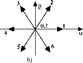 L-CRR,4bYpMS-R4 - Ч = Ч -d = (19.126) where is the time constant of the desired first-order response of output voltage i; ( > T > 0). For the synthesis of the closed-loop control system, notice that the terms of (19.126) inside the square brackets can be assumed as the reference current . Furthermore, from (19.125) and (19.126) it is seen that current control loops for and are needed. Considering (19.122) and (19.120), the two sliding surfaces can be written SM,t) = i-i, = 0 (19.127a) Sp(e,, t) = - = 0 (19.127b) The switching laws relating the sliding surfaces (19.127) with the switching variables are If 5,(\, t)> 8 then z; > hence choose y to increase the current If a,p(\f, 0 < -e then 4 < 4 hence choose y to decrease the current (19.128) The practical implementation of this switching strategy could be accomphshed using three independent two-level hysteresis comparators. Fiowever, this might introduce limit cycles as only two line currents are independent. Therefore, the control laws (19.127) can be implemented using the block diagram of Fig. 19.47a, with d,q-a,P (from (19.122)) and 1,2-а,5 (from (19.120)) transformations and two three-level hysteretic comparators with equivalent hysterisis г and p to limit the maximum switching frequency. A limiter is included to bound the i reference current to ijmax keeping the input line currents within a safe value. This helps to eliminate the nonminimum-phase behavior (outside sliding mode) when large transients are present, while providing short-circuit-proof operation. a- Space Vector Current Modulator Depending on the values of y, the bridge rectifier leg output voltages can assume only eight possible distinct states represented as voltage vectors in the a- reference frame (Fig. 19.47b), for sources with isolated neutral. With only two independent currents, two three-level hysterisis comparators, for the current errors, must be used in order to accurately select all eight available voltage vectors. Each three-level comparator can be obtained by summing the outputs of two comparators with two levels each. One of these two comparators (Siq, dif) has a wide hysterisis width and the other {d, df) has a narrower hysterisis width. The hysterisis bands are represented by 8 and p. Table 19.2 represents all possible output combinations of the resulting four two-level Space vector decoder & driver ![]() To power switches ![]() TABLE 19.2 Two-level and three-level comparator results, showing corresponding vector choice, corresponding and vector component voltages. Vectors are mapped in Fig. 19.47b