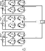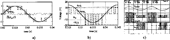 S33 П AC \ Load j FIGURE 19.50 (a) Single phase, neutral-clamped, three-level inverter with IGBTs; (b) three-phase, neutral-clamped, three-level inverter. Considering single-phase three level inverters (Fig. 19.50a), open-loop control of the output voltage can be made using three-level SWPWM. The two-level modulator, seen in Example 19.9, can be easily extended (Fig. 19.52a) to generate the ущ command (Fig. 19.52b) to three-level inverter legs, from the two-level 7jj signal, using the following relation: 7lII - 7lI(mi,sin(cof)-sgn(m,sin(cof))/2-r(f)/2) - 1/2 + sgn(m sin(a;t))/2 (19.131) The required three-level SWPWM modulators for the output voltage synthesis seldom take into account the semiconductors and the capacitor voltage divider nonideal characteristics. Consequently, the capacitor voltage divider tends to drift, one capacitor being overcharged, the other discharged, and an asymmetry appears in the currents of the power supply. A steady-state error in the output voltage can also be present. Sliding-mode control can provide the optimum switching timing between aU the converter levels, together with robustness to supply voltage disturbances, semiconductor nonidealities, and load parameters. Sliding-Mode Switching Law For a variable-structure system where the control input Ui(t) can present n levels, consider the n values of the integer variable 7, being -(n - I)/2 < у < (n - 1)/2 and Ui(t) = yU /(n - 1), dependent on the topology and on the conducting semiconductors. To ensure the sliding-mode manifold invariance condition (19.76) and the reaching mode behavior, the switching strategy y(t]i) for the time instant t, considering the value of y(t) must be y(t) + 1 if S(e., t) > г л S(e., t) > eA7(tfc) < (n-l)/2 (19.132) 7(tfc)-l if S(e, t) <-8 A S(e, t) < -8 A 7(tfc) > -(n - l)/2 ![]() Hrs8 > I I I---It narll i ![]() FIGURE 19.51 (a) Five-level {n = 5) diode clamped inverter with IGBTs; (b) five-level {n = 5) flying capacitor converter; (c) multilevel converter based on cascaded full bridge inverters. Modulation Index Product2 Sine №ve (PU) r(t) PU Relay S4 Hysteriss 10-5 High outut=0.5 Low output=-0.5 gamalll 0.5*8gn ► 0>>- Gain FIGURE 19.52 (a) Three-level SWPWM modulator schematic; (b) main three-level SWPWM signals. ![]() S(exi.t) -epsi-t-eps out:+1-1 >Ju/clt>- f(u) (u[iru[2]>0)* dS/dt -eps;+eps out:+1-1 ±(n-1)/£ gama Memory S(exi.t -1.3eps;+1.3eps out>0.5,+0.5 -1.2eps;+1.2eps out>0.5,+0.5 -eps;+eps out:-0.5,+0.5 -1.1eps;+1.1eps out:-0.5,+0.5 gama decoder FIGURE 19.53 (a) Multilevel sliding-mode PWM modulator with -level hysteresis comparator of quantization interval e; (b) a four hysterisis comparator implementation of a five-level switching law. This switching law can be implemented as depicted in Fig. 19.53. Control of the Output Voltage in Single-Phase Multilevel Converters To control the inverter output voltage, in a closed loop, in diode-clamped multilevel inverters with n levels and supply voltage (7, a control law similar to (19.116), S(e,, t) = KJ(u,-kMUJ(n-l))dt = 0, is suitable. Figure 19.54a shows the waveforms of a five-level sliding-mode controlled inverter, namely the input sinus voltage, the generated output staircase wave, and the sliding-surface instantaneous error. This error is always within a band centered around the zero value and presents zero mean value, which is not the case of ![]() FIGURE 19.54 (a) Scaled waveforms of a five-level sliding-mode controlled single-phase converter, showing the input sinus voltage Vp, the generated output staircase wave u, and the value of the sliding surface S(ei, t); (b) scaled waveforms of a three-level neutral-point clamped inverter showing the capacitor voltage unbalance (shown as two near flat lines touching the tips of the PWM pulses); (c) experimental results from a laboratory prototype of a three-level single-phase power inverter with the capacitor voltage equalization described. 1 -vpwmr kvvpwm Sum4 integr gama n level hysterisis comparator LU int Sum4 gama n level hysterisis comparator kc-(uc2-Ucc/2) kc*(uc2-Ucc/2) figure 19.55 (a) Multilevel sliding-mode output voltage controller and PWM modulator with capacitor voltage equalization; (b) Sliding-mode output current controller with capacitor voltage equalization. 2000 -2000 ![]() 1 0 0.01 0.02 0.03 0.04 time [s] 0.05 0 0.01 0.02 0.03 0.04 0.05 time [s] 0 0.01 0.02 0.03 0.04 0.05 time [s] figure 19.56 Simulated performance of a five-level power inverter, with a U voltage dip (from 2kV to 1.5 kV). Response to a sinusoidal wave of frequency 50 Hz. (a) Vpjj input; (b) PWM output voltage u; (c) the integral of the error voltage, which is maintained close to zero. sigma-delta modulators foUowed by n-level quantizers, where the error presents an offset mean value in each half period. Experimental multilevel converters always show capacitor voltage imbalances (Fig. 19.54b) due to smaU differences between semiconductor voltage drops and circuitry offsets. To obtain capacitor voltage equalization, the voltage error (v, - U,J2) is fed back to the controller (Fig. 19.55a) to counteract the circuitry offsets. Experimental results (Fig. 19.54c) clearly show the effectiveness of the correction made. The smaU steady-state error between the voltages of the two capacitors still present could be eliminated using an integral regulator (Fig. 19.55b). Figure 19.56 confirms the robustness of the sliding-mode controller to power supply disturbances. Output Current Control in Single-Phase Multilevel Converters Considering an inductive load with current ii, the control law (19.91) and switching law (19.132), should be used for single-phase multilevel inverters. Results obtained using the capacitor voltage equahzation principle just described are shown in Fig. 19.57. Example 19.16. Sliding-Mode Controllers for Three-Phase Multilevel Inverters. Three-phase n-level inverters (Fig. 19.58) are suitable for high-voltage, high-power dc-ac applications, such as modern highspeed railway 
