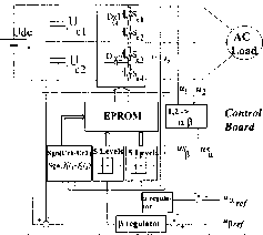 transitions on inverter legs are obtained. If there is no directly corresponding vector, then the nearest vector guaranteeing adjacent transitions is selected. If more than one vector is the nearest, one is selected to equalize the capacitor voltages. One of the three vectors (1, 14, 27) corresponding to the zero vector is selected to minimize the switching frequency. The discrete values of Я^, allow 25 different combinations. As only 19 are distinct from the load viewpoint, the extra ones can be used to select vectors able to equalize the capacitor voltages. From circuit analysis it can be seen that vectors {2, 5, 6, 13, 17, 18} result in the discharge of capacitor Cp if the inverter is operating in Ъ Levfil f!oTiveFteii ![]() the inverter mode, or in the discharge of if the inverter is operating as a boost rectifier. Similar reasoning can be applied for vectors {10, 11, 15, 22, 23, 26} and capacitor C2. Therefore, considering the vector 2 = [(7i,2/2)(7i,2 + 1) - (7з/2)(7з + 1)] if (ci 02) x(Tiz\ + T2i2) > 0, then according to Я^,, choose one of the vectors {2,5,6, 13, 17, 18} (Table 19.4). If (Uqi - 112) Cih + 2h) < 0 then according to Я^,, choose one of the vectors {10, 11, 15, 22, 23, 26} (Table 19.5). As an example, consider the case where > (72-Then the capacitor C2 must be charged and Table 19.4 must be used if the multilevel inverter is operating in the inverter mode or Table 19.5 for the regenerative mode. Addicionally, when using Table 19.4, if Я^, = - 1 and Я^ = -1, then vector 13 should be used. Experimental results shown in Fig. 19.61 were obtained with a low-power, low-voltage laboratory prototype (150 V, 3kW) of a three-level inverter (Fig. 19.60), controlled by two four-level comparators, plus described capacitor voltage equalizing procedures and EPROM-based lookup Tables 19.3, 19.4 and 19.5. Transistors IGBT (MG25Q2YS40) were switched at frequencies near 4-kFiz, with neutral clamp diodes 40FiFL, Ci C2 20 mF. The load was mainly inductive (3 X 10 mH, 2Q). The inverter number of levels (three for the phase voltage and five for the line voltage), together with the adjacent transitions of inverter legs between levels, are shown in Fig. 19.61a) and, in detail, in Fig. 19.62a). The performance of the capacitor voltage equahzing strategy is shown in Fig. 19.62b, where the reference current of phase 1 and the output current of phase 3, together with the power supply voltage (U 100V) and the voltage of capacitor C2 (/2), can be seen. It can be noted that the U(j2 voltage is nearly half of the supply voltage. Therefore, the capacitor voltages are nearly equal. Furthermore, it can be stated that without this voltage equalization procedure, the three-level inverter operates only during a brief transient, during which one of the capacitor voltages vanishes to nearly zero volts and the other is overcharged to the supply voltage. Figure 19.61b shows the harmonic spectrum of the output voltages, where the harmonics due to the switching frequency (4.5 kFiz) and the fundamental harmonic can be seen. On-line Output Current Control in Multilevel Inverters Considering a standard inductive balanced load (R, L) with electromotive force {u) and isolated neutral, the converter output currents can be expressed FIGURE 19.60 Block diagram of the multilevel converter and control board. (19.144) CH1S50V CH2S50V CH4=20mV 2nfis/div 11Шп11Н111 ![]() a) b) FIGURE 19.61 (a) Experimental results showing phase and line voltages; (b) Harmonic spectrum of output voltages. Now analysing the circuit of Fig. 19.58, the multilevel converter switched state-space model can be obtained: The application of the Concordia matrix (19.135) to (19.145), reduces the number of the new model (19.146) equations to two, since an isolated neutral is assumed d Jt