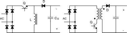 FIGURE 21.29 High-power-factor ballasts. RESONANT INVERTER lamp TABLE 21.4 lEC 1000-3-2: harmonic Hmits for class С equipment Harmonic order n 2 3 5 7 9 11 <л <39 (odd harmonics only) Maximum Permissible Harmonic Current Expressed as a Percentage of the Input Current at the Fundamental Frequency 30Г 10 Я is the circuit power factor for equipment supplied from voltages lower than 220 V have not yet been established. This regulation divides electric equipment into several classes from class A to class D. Class С is especially for lighting equipment, including dimming devices; the harmonic hmits for this class are shown in Table 21.4. As shown in the table, this regulation establishes a maximum amplitude for each input harmonic as a percentage of the fundamental harmonic component. The harmonic content established in Table 21.4 is quite restrictive, which means that the input current wave must be quite similar to a pure sine wave. For example, for a typical input power factor equal to 0.9 the total harmonic distortion calculated from Table 21.1 is only 32%. 21.5.2 Passive Solutions A first possibility to increase the ballast power factor and to decrease the harmonic content of the input current is the use of passive solutions. Figure 21.30 shows two typical passive solutions, which can be used to improve the input power factor of electronic baUasts. Figure 21.30a shows the most common passive solution based on a filter inductor L Using a large inductance L a square input current can be obtained, with an input power factor of 0.9 and a THD of about 48%. A square input waveform does not satisfy the lEC 1000-3-2 requirements and thus is not a suitable solution. The addition of capacitor С across the ac terminals can increase the power factor to 0.95, but StiU the standard requirements are difficult to fulfiU. Co = Co = (a) (b) FIGURE 21.30 Passive circuits to improve input power factor: (a) LC filter; and (b) tuned LC filter. A simple variation of this circuit is shown in Fig. 21.30b, where a parallel circuit tuned to the third harmonic of the line frequency is used to improve the shape of the line current. The input power factor obtained with this circuit can be close to unity. A third possible solution, known as the vaUey-fiU circuit, is shown in Fig. 21.31a. The typical filter capacitor following the diode rectifier is split into two different capacitors that are alternately charged using three extra diodes. The addition of a smaU series resistor improves the power factor in about two points, maintaining low cost for the circuit. An inductor in place of the resistor can also be used to improve the power factor, but with a higher cost penalty. Figure 21.31b shows the output voltage and input current of the vaUey-fiU circuit. The main disadvantage of this circuit is the high ripple of the output voltage, which produces lamp power and luminous flux fluctuation and high lamp current crest factor. Passive solutions are reliable, rugged, and cheap. However, the size and weight of these solutions are high and their design to fulfiU the lEC 1000-3-2 requirements is usually difficuh. Therefore, they are normally applied in the lower power range. 21.5.3 Active Solutions Active circuits are the most popular solutions for implementing high-power-factor electronic ballasts. They use controUed switches to correct the input power factor and in some cases to include galvanic isolation via high-frequency transformers. Active circuits normally used in electronic baUasts operate at a switching frequency weU above the line frequency and over the audible range. Some typical active circuits used in electronic baUasts are shown in Fig. 21.32. Buck-boost and flyback converters, shown in Figs. 21.32a and 21.32b, respectively, can be operated in discontinuous conduction mode (DCM) with constant frequency and constant duty cycle in order to obtain an input power factor close to unity [25]. Figure 21.32c shows the boost converter, which is one of the most popular active circuits used to correct the input power factor of electronic ballasts [26-28]. If the boost converter is operated in DCM, an input power factor close to unity is obtained, provided that the output voltage is about twice the peak input voltage [26]. The main disadvantage of DCM operation, when compared to the CCM mode, is the high distortion of the input current (due to the discontinuous high-frequency current) and the higher current and voltage stresses in the switches. Therefore, DCM operation is only used for the lower power range. For the medium power range, the operation of the boost converter at the DCM-CCM borderline is preferred. In this solution the on time of the controUed switch is maintained constant within the whole line period, and the switching frequency is adjusted to aUow the input current to reach zero at the end of the switching period. The typical control 400V ![]() -200V