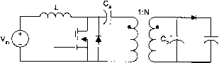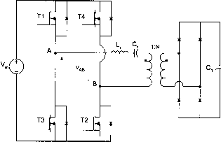 figure 22.6 Boost charging. capacitor voltage is a function of t. The peak capacitor voltage is hmited to 2Vq without S2; voltage gains as high as 20 are possible with the addition of S2 [1]. The switching elements in Figs. 22.4 and 22.5 are realized with thyristors. Simple switches are shown for the boost charging technique in Fig. 22.6. Switch could be implemented with a thyristor. The boost capability provided by switch S2 is best realized with a gate-controlled semiconductor device such as a GTO or an IGBT. 22.4 Switching Converters The poor efficiency when charging a capacitor through a resistor from a high-voltage power supply hmits its apphcation to low charging rates. In the resonance charging concepts, the energy is transferred to the load capacitor in a single pulse, and it is not possible to compensate for capacitor leakage. Energy storage capacitors may be charged utilizing the same power electronic technology that has been applied in switching converters for constant power loads. Instead of charging the energy storage capacitor with a single pulse, switching converters can charge the capacitor with a series of pulses, or pulse train. The peak current is reduced when charging with a series of pulses, thus improving the efficiency of the charging process. In addition, soft-switching techniques may be employed in the switching converter to increase the efficiency. The regulation of the output voltage is also improved with the pulse train, because the energy is passed to the energy storage capacitor as smaU packets. Common control techniques such as pulse-width modulation can be used to control the size of the energy packet. This capability to control the size of the energy packet permits the CCPS to operate in the refresh mode and compensate for capacitor leakage. As a result, the CCPS may operate over a broad range of load repetition rates and StiU maintain the desired output voltage. During the refresh mode, energy lost as a result of capacitor leakage may be replaced in a burst fashion [2] or in a continuous fashion similar to trickle charging a battery [3]. In the switching converter, semiconductor switches may be operated on the low side of the transformer, permitting the use of MOSFETs or IGBTs in the CCPS. Since the CCPS begins the charging mode with a short circuit across its output, the switching converter must be capable of operating under this severe load condition. This may require the implementation of a current-limiting scheme in the converter control circuit. One switching converter topology that may be employed in capacitor charging apphcations is the series resonant converter in Fig. 22.7. Note that the MOSFETs and resonant components and Q are connected on the low-voltage side of the transformer. Only the rectifier diodes and energy storage capacitor must have high voltage ratings. When the output rectifier is conducting, the energy storage capacitor Q is connected in series with the resonant capacitor Q. For a ![]() FIGURE 22.7 Series resonant converter. transformer turns ratio of 1:N, reflecting Q through the transformer yields a capacitance of Q. Since N is typically large, this reflected capacitance is much larger than Q; thus, the resonant frequency, which is defined in Eq. (22.10), is not affected by Q. For high-voltage, high-frequency operation, the leakage inductance of the transformer may be utilized as Ц (22.10) One characteristic of this converter that makes it attractive for capacitor charging is the abihty to operate under the short circuit conditions present at the beginning of the charging mode. The voltage across Q is zero at the beginning of this mode. The current flowing in the converter is limited by the input voltage and the impedance Zq, which is defined in Eq. (22.11). The current may be limited to a safe maximum value; however, the charge time will be increased (22.11) Another method for current limiting is to vary the ratio of f, the switching frequency of the MOSFETs, and the resonant frequency, which is co/2n. This effectively controls the flow of energy from the source to Q. The switching frequency may be held constant at some value such as 0.5/. Alternatively, the ratio of to may be set to a low value at the beginning of the charging mode and increased toward 1 as the voltage across Q builds up. This hmits the current when the voltage across Q is low and allows increased energy transfer as the voltage approaches the target voltage. The disadvantage of this approach is that aU circuit components must be designed for variable-frequency operation. The flyback converter [4, 5], shown in Fig. 22.8, also may be utilized for capacitor charging applications. When the MOSFET is turned on, current builds up in the primary N1:N2 ![]() ![]() FIGURE 22.8 Flyback converter. winding, storing energy in the magnetic field. When it reaches a specified level, the MOSFET is turned off and energy is transferred from the magnetic field to Q. This energy transfer is terminated when the MOSFET is turned on again. Sokal and Redl [4] have investigated different control schemes for charging capacitors using the flyback converter. Their recommendation is to charge Q with current pulses that are nearly flat-topped. This strategy results in higher average current for a given peak current. The capacitor is charged faster, because the charge delivered to it during a pulse is directly proportional to the average current. This desired pulse shape is achieved by turning on the MOSFET to terminate the transfer of energy to Q soon after the MOSFET is turned off. When the primary current reaches the desired level, the MOSFET is again turned off. Another converter for capacitor charging applications is the Ward converter [6-8] shown in Fig. 22.9. When the MOSFET is on, energy is stored in the inductor and capacitor Q transfers energy to the energy storage capacitor Q and capacitor Q. The energy stored in the inductor is transferred to Q when the MOSFET is off. The leaka