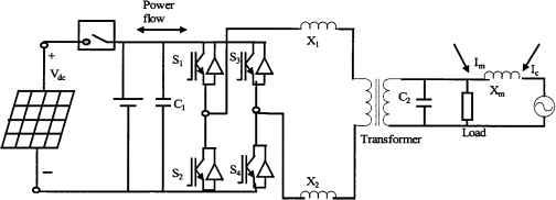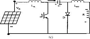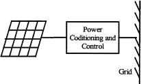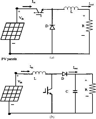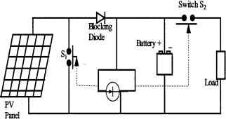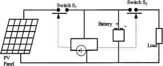 Battery PV Panel ![]() figure 23.7 (a) Stand-alone PV system; (b) PV-diesel hybrid system; (c) grid-connected PV system. - Industrial batteries - - Automoti e batteries ![]() No of cycles figure 23.8 Nominal number of battery cycles vs depth-of-discharge. discharged through the PV ceUs at night when there is no sun available to generate energy. These blocking diodes also protect the battery from short circuits. In a solar power system consisting of more than one string connected in paraUel, if a short-circuit occurs in one of the strings, the blocking diode prevents the other PV strings from discharging through the short-circuited string. The battery storage in a PV system should be properly controlled to avoid catastrophic operating conditions like overcharging or frequent deep discharging. Storage batteries account for most PV system faUures and contribute significantly to both the initial and the eventual replacement costs. Charge controUers regulate the charge transfer and prevent the battery from being excessively charged and discharged. Three types of charge controUers are commonly used: Series charge regulators Shunt charge regulators Dc-dc Converters 23.2.3.1.2.1 Series Charge Regulators The basic circuit for the series regulators is given in Fig. 23.9. In the series charge controUer, the switch Si disconnects the PV generator when a predefined battery voltage is achieved. When the voltage faUs below the discharge limit, the load is disconnected from the battery to avoid deep discharge beyond the limit. The main problem associated with this type of controUer is the losses associated with the switches. This extra power loss has to come from the PV power, and this can be quite significant. Bipolar transistors, MOSFETs, or relays are used as the switches. 23.2.3.1.2 Shunt Charge Regulators In this type, as illustrated in Fig. 23.10, when the battery is fully charged the PV generator is short-circuited using an electronic switch (S). Unlike series controUers, this method works more efficiently ![]() Charge Controller figure 23.9 Series charge regulator. ![]() Charge Controno- figure 23.10 Shunt charge regulator. even when the battery is completely discharged, as the short-circuit switch need not be activated until the battery is fully discharged [1]. The blocking diode prevents short-circuiting of the battery. Shunt charge regulators are used for smaU PV applications (less than 20 A). Deep-discharge protection is used to protect the battery against deep discharge. When the battery voltage reaches below the minimum set point for the deep-discharge limit, switch S2 disconnects the load. Simple series and shunt regulators aUow only relatively coarse adjustment of the current flow and seldom meet the exact requirements of PV systems. 23.2.3.1.2.3 Dc-dc Converter Type Charge Regulators Switch mode dc-to-dc converters are used to match the output of a PV generator to a variable load. There are various types of dc-dc converters: Buck (step-down) converter Boost (step-up) converter Buck-boost (step-down/up) converter Figures 23.11a, 23.11b, and 23.11c show simplified diagrams of these three basic types of converters. The basic concepts are an electronic switch, an inductor to store energy, and a flywheel diode, which carries the current during that part of switching cycle when the switch is off. The dc-dc converters aUow the charge current to be reduced continuously in such a way that the resulting battery voltage is maintained at a specified value. 23,2,3,1,3 Maximum-Power-Point-Tracking (MPPT) A controUer that tracks the maximum-power-point locus of the PV array is known as an MPPT. In Fig. 23.12, the PV power output is plotted against the voltage for insolation levels from 200 W/m to 1000 W/ml The points of maximum array power form a curve termed as the maximum power locus. Because of the high cost of solar cells, it is necessary to operate the PV array at its maximum power point. For overaU optimal operation of the system, the load line must match the PV arrays maximum-power-point locus. Referring to Fig. 23.13, the load characteristics can be either curve OA or curve OB, depending on the nature of the load and its current and voltage requirements. If load OA is considered and the load is directly coupled to the solar array, the array wiU operate at point Al, delivering only power Pl. The maximum array power available at the given insolation is P2. In order to use PV array power P2, a power conditioner coupled between the array and the load is needed. There are two ways of operating PV modules at the maximum power point: (a) Open-loop control. The open-loop method is based on the assumption that the maximum-power-point voltage У^рр is a linear function of the open-circuit voltage Vqc- ![]() PV panels ![]() PV panels FIGURE 23.11 (a) Buck converter; (b) boost converter; (c) Buck-boost converter. example, У^рр = к Vqc where /с 0.76. This assumption is reasonably accurate even for large variations in the ceU short-circuit current and temperature. This type of MPPT is probably the most common type. A variation to this method involves periodically open-circuiting the ceU string and measuring the open-circuit voltage. The appropriate value of Vmpp can then be obtained with a simple voltage divider. (b) Closed-loop control. The closed-loop control involves varying the input voltage around the optimum value by giving it a smaU increment or decrement alternately. The effect on the output power is then assessed and a further smaU correction is made to the input voltage. This type of control is caUed a hiU-climbing control. The power output of the PV array is sampled ![]() FIGURE 23.12 Typical power/voltage characteristics for increased insolation. Constant power Points ![]() Array voltage FIGURE 23.13 PV array and load characteristics. at an every definite samphng period and compared with the previous value. In the event, when power is increased, the solar array voltage is stepped in the s