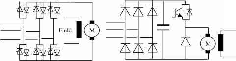 Speed -► FIGURE 26.2 Operating regions of electric VSD. For regenerative drive, the power electronics converter has to be designed to be able to handle bidirectional power flow. In low- and medium-power converters (say <500kW) with slow dynamic braking demands, the generated power during the braking periods is interchanged with the strong filter capacitor of power electronics converter, or dc (dynamic) braking is used. 26.4.2.5 Dynamic Braking Energy There exist two types of energy stored in VSD, which need to be dealt with during dynamic braking: Inertia or kinetic energy loads. Typically moving (rotating or linear) machines. These would decelerate naturally to rest. Braking can speed up the process cycle for the sake of productivity. Mass or potential energy loads. Typically hoists or lifts - which would run on or even accelerate. Braking must apply fuU power to maintain constant speed while the load is lowered. The drive losses, mechanical resistance, and transmission efficiency work in favor of deceleration, reducing the braking power demand. The energy regenerated by potential energy loads depends on maximum power and both the overrun time and the decelerating time. The braking time and the duty cycle time are decided by the requirements of the process system, but note particularly the effect of varying the braking duty cycle time and the deceleration time. For dc injection braking, the kinetic energy of the motor-load system is converted to heat in the motor rotor. For fast and frequent generator braking, the power electronics converter has to handle the generated power either by a controlled dynamic brake chopper (with braking resistor) or through bidirectional power flow. The power losses in the converter can assist in dynamic braking. For a fast speed response, modern variable-speed drives may develop a maximum transient torque up to base speed and maximum transient power up to maximum speed, provided that both the motor and the power electronics converter can handle these powers. For a 200-kW dynamometer drive application, a rapid change of torque from full positive torque to full negative torque is required in less than 10 ms. 26.5 Variable-Speed Drive Topologies In this section drive topologies are classified according to the motor they employ. Various pubhcations have dealt with this subject [6, 7]. The most common motors are illustrated in Fig. 26.3. 26.5.1 Dc Motor Drives Until recently, the dc motor drive was the most commonly used type of electric-variable speed drive; with very few exceptions it is the least expensive. The mechanical commutator is an electromechanical dc to ac bidirectional power flow power converter, as the currents in the rotor armature coils are ac while the brush current is dc. The dc drive is well known, well proven, and widely applied, yet its popularity is in relative decline because of the emergence of the more robust, lower-cost squirrel-cage induction motor drive. Electric Variable Speed Drives Special drives Stepper Motor Integral motor Induction Motor Synchronous Motor Squirrel cage Cyclo j Matrix j CSI j VSI j FCI(IM) j LCI(SM) j FIGURE 26.3 Classification of electric VSDs. Unfortunately, the mechanical commutator, though not bad in terms of losses and power density, has serious commutation current and speed limits and thus limits the power per unit to 1-2 MW at 1000 rpm and may not be at all accepted in chemically aggressive or explosion-prone environments. The application of the dc drive has been restricted in hazardous areas because of the very hmited availability of flameproof dc machines. Commutator and brush maintenance is difficult in such environments. Furthermore, continuous sparking at the brushes is virtually inevitable at full load output. Because of the inherent ease of speed control of the separately excited dc machine, dc drives found popularity in early electric drive applications, by varying the applied armature voltage. This variable armature voltage is simply generated by phase-controlled rectification, and this technique has now almost entirely replaced the Ward-Leonard systems previously used. The ac/dc converter offers a variable dc voltage, which is capable of four-quadrant operation (positive and negative dc voltage and dc current output). Permanent magnet-excited brushed motors have been used in numerous applications for sometime, particularly in nonregenerative drive applications. Motor output torque is approximately proportional to armature current and motor speed approximately proportional to converter output voltage. Speed control by sensing armature voltage is therefore feasible, giving an accuracy of around 5%. Provided the motor excitation is kept constant, the dc drive power factor is proportional to motor speed. Since most pumps, compressors, and fans demand a torque proportional to the square of speed, constant excitation systems are used and so the preceding relationship apphes: A typical power factor at maximum rated speed for a dc drive is 0.85. This relationship applies to many other types of electric drives. If a slow dynamic response is satisfactory, regeneration to the mains supply is achieved by reversing either the motor field or the armature connection. Alternatively, regeneration with faster response is achieved by connecting another thyristor bridge in antiparallel with the main bridge (Fig. 26.4a). In this case fast response is possible with changeover times of <15ms between full torque motoring to full torque regenerating. The 6-pulse drive configuration is acceptable for powers Field ![]() (a) (b) FIGURE 26.4 Dc drive: (a) with fully controlled antiparallel supply bridge; (b) diode rectifier with dc chopper. up to 1 MW. This hmitation does not arise from any semiconductor device hmitation, but is due to ac hne current harmonics the converter generates. A force-commutated or chopper converter for dc motors uses the principle of variable mark-space control using a thyristor or transistor sol