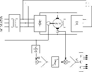 1 5 4 ![]() FIGURE 27.9 Bidirectional speed and position control system with a PWM transistor bridge drive. Four-quadrant PWM converter drives such as that in Fig. 27.10 are widely used for motion-control equipment in the automation industry. Because of significant development of power switching devices, switching frequencies of 10-20 kFiz are easily attainable. At such frequencies, virtually no derating of the motor is necessary. In order to satisfy the requirements of a drive apphcation, simpler versions of the drive circuits indicated in Figs. 27.7 and 27.9 may be used. For instance, for a unidirectional drive half of the converter circuits indicated earlier may be used. Further simphfication of the drive circuit is possible if regenerative braking is not required. FIGURE 27.11 dc drive. Structure of a closed-loop speed-control system with a 27.2.4 Drive System Integration A complete drive system has a torque controUer (armature current controUer for a dc drive) as its innermost loop, followed by a speed controller as indicated in Fig. 27.11. The inner current loop is often regulated with a proportional plus integral (PI) type controller of high gain. The rest of the inner loop consists of the converter, the motor armature, which is essentially an R-L circuit with armature back emf as disturbance, and the current sensor. The current sensor is typically an isolated circuit, such as a FiaU sensor or a direct-current transformer (DCCT). A weU-designed torque (armature current) loop behaves essentially as a first-order lag system. Together with the mechanical inertia load, this loop can be indicated as the middle Bode plot of Fig. 27.12, in which 1/T represents the current-controUed system bandwidth. (Note that the damping factor D and the load torque Tl indicated in Fig. 27.11 have been neglected in this description for simplicity.) The current loop is normally designed by analyzing the block diagram of Fig. 27.11, the converter, and Forward Forward Running Reverse Braking Acceleration Forward Running Forward Braking Reverse Acceleration ![]() ![]() ![]()