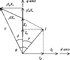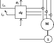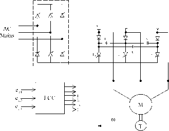 ![]() inverter drive cannot normally be operated open-loop, like the V-f inverter drive. For high dynamic performance, vector-controlled drives are becoming popular. 27.3.4 Vector Controls The foregoing scalar control methods are only suitable for adjustable-speed applications in which the load speed or position is not controlled as in a servo system. The vector control technique allows a squirrel-cage induction motor to be driven with high dynamic performance, comparable to that of a dc motor. For this, the controller needs to know the rotor speed (in the indirect method) or the airgap flux vector accurately, using sensors. The latter method is not practical because of the requirement of attaching airgap flux sensors. + Id- -I, - Тб j T, FIGURE 27.23 Dc-link current-source thyristor inverter drive. Stator current (A) ![]() -2-1012 Rotor frequency (Hz) FIGURE 27.25 Stator current vs rotor (slip) frequency for constant-airgap flux operation. ![]() FIGURE 27.26 Variable-current, variable-frequency inverter drive scheme. The indirect method, which is being widely accepted in recent years, requires the controUer to be matched with the motor being driven. This is because the controUer needs also to know some rotor parameter(s), which may vary according to the conditions of operation, continuously. 27.3.4.1 Basic Principles The methods of vector control are based on the dynamic equivalent circuit of the induction motor. There are at least three fluxes (rotor, airgap, and stator) and three currents or mmfs (stator, rotor, and magnetizing) in an induction motor. For high dynamic response, interactions among current, fluxes, and speed must be taken into account in determining appropriate control strategies. These interactions are understood only via the dynamic model of the motor. AU fluxes rotate at synchronous speed. The three-phase currents create mmfs (stator and rotor) that also rotate at synchronous speed. Vector control aligns axes of an mmf and a flux orthogonally at aU times. It is easier to align the stator current mmf orthogonally to the rotor flux. Any three-phase sinusoidal set of quantities in the stator can be transformed to an orthogonal reference frame by /о cosO cos( sm и sm\ и -- sini в- fas fbs fcs (27.27) where в is the angle of the orthogonal set with respect to any arbitrary reference. If the axes are stationary and the a axis is aligned with the stator a axis, then в = 0 at aU times. Thus Jos. V3 V3 fas fbs .fcs. (27.28) If the orthogonal set of reference rotates at the synchronous speed 1, its angular position at any instant is given by CO, f + 0n (27.29) The orthogonal set is then referred to as d-q-0 axes. The three-phase rotor variables, transformed to the synchronously rotating frame, are fdr f,r fo C0s(C0-C0)t COSco-co)t- COSTCO-co)t- sm{(D-(jo)t smi (cOg-cojt--j smi (ш^-cojt-- far fbr Ifcr] (27.30) It should be noted that the difference - is the relative speed between the synchronously rotating reference frame and the frame attached to the rotor. This difference is the also slip frequency, cd which is frequency of the rotor variables. By applying these transformations, voltage equations of the motor in the synchronously rotating frame reduce to The stator flux linkage equations are \s = Us\s + m(V + V) = 5 V + V (27.32) ds = Ushs + Lm{4s + hr) = Lsids + LJdr (27.33) (27.34) pLm ((Oe-r)Lm Rr РЦ i0J,-(D,)L, -(ш,-ш,) pL -{оэ,-со,)Ц Rr+pL, The rotor flux linkages are given by dr = Urhr + m(4 + 4r) = Lridr + LJds (27.36) (27.31) where the speed of the reference frame, ш^, is equal to co and Subscripts / and m stand for leakage and magnetizing, respectively, and p represents the differential operator d/dt. The equivalent circuits of the motor in this reference frame are indicated in Figs. 27.27a and 27.27b. n COeXds Lis r r Llr (C0e-C0r)Xdr R, - Iqs Iqr JTYYV- > I < rYYYV (a) ids idr JTYYV- > I < ((Oe-(Or)Xqr FIGURE 27.27 Motor dynamic equivalent circuits in the synchronously rotating (a) q- and (b) J-axes. - \l (qr + dr) The airgap flux linkages are given by md = Lm(.4s + 4r) m - \l imqs + mds) The torque developed by the motor is given by 3P From Eq. (27.39), the rotor voltage equations are i;, = 0 = + (CO, - CD,)LJds + {Rr + (27.37) (27.38) (27.39) (27.40) (27.41) + (со, - (D,)L,idr Vdr = 0 = L (CO, - CD,)LJ, + (R, + L,) (27.42) Using (27.35) and (27.36), (27.43) + Я V + - = 0 (27.44) dr + R,idr + (Ш, - CD,)X = 0 (27.45) Also from (27.35) and (27.36), -I2 -hi- (27.46) (27.47) The rotor currents i and i can be ehminated from (27.44) and (27.45) by using (27.46) and (27.47). Thus qr (27.48) - R,i, + (CO, - co,)Ad, = 0 (27.49) is reduced in order to weaken the rotor flux so that the motor may be driven with a constant-power-hke characteristic. Based on how the rotor flux is detected and regulated, two methods of control are available. One is the more popular indirect-rotor flux-oriented control (IFOC) method, and the other is the direct vector control method; both are described hereafter. A condition for elimination of transients in rotor flux and the coupling between the two axes is to have The rotor flux should also remain constant so that From (27.50) and (27.51), L R . + 1 -L i (27.50) (27.51) (27.52) (27.53) Substituting the expressions for i and i into (27.35) and (27.36), (27.55) Substituting and from (27.54) and (27.55) into the torque equation of (27.41) ~ ~ Tdrqs ~ qrds) - ~ ~r\s 2 и (27.56) It is clear from (27.53) that the rotor flux is determined by ij, subject a time delay that is the rotor time constant (LJR). Current i, according to Eq. (27.56), controls the developed torque T without delay. Currents i and i are orthogonal to each other and are called the flux and torque-producing currents, respectively. This correspondence between flux and torque-producing currents is subject to maintaining the conditions in (27.50) and (27.51). Normally, i would remain fixed for operation up to the base speed. Thereafter, it 27.3.4.2 Indirect-Roto
