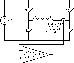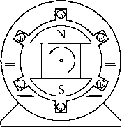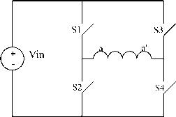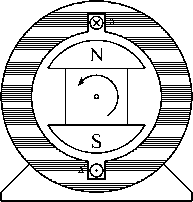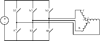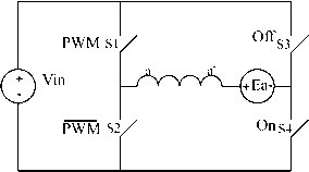 angle ![]() FIGURE 27.56 A simple motor with a single coil in the stator and a permanent-magnet rotor. FIGURE 27.57 A computer-generated magnetic field for current in the windings and a stator; the stator is made of electrical steel. equation that very rapidly and simply gives numeric answers. The directions of the force, current, and motion are all orthogonal, i.e., at right angles, and a formal exposition would again use a vector cross product. The familiar force equation, F = BLI, can be used, where F is the force in newtons, В is the flux density in teslas, L is the length of the conductor in meters, and / is the current in amperes. Consider the simple machine of Fig. 27.56. The rotor is a magnet with a north and a south pole, and there is a coil of wire in the slots in the stator. Current is shown going into the conductor called a at the top of the stator and coming out of the conductor called a at the bottom. To simulate a real machine more closely, one should imagine putting a one-turn coil of wire into the slot, with a connection made at the back of the machine to connect the top wire to the bottom, so that when applying a positive voltage is applied to the top wire and a negative voltage to the end of the coil (the bottom wire), current will flow in at the top and out at the bottom as discussed previously. 27.6.1.3.1 Method 1 If the current is flows into the top and comes out of the bottom as marked, then according to the right-hand rule magnetic flux will be forced to go through the center of the coil from right to left, creating a north pole on the left. The flux will then double back through the iron frame of the motor to arrive back at the south pole on the right. Figure 27.57 shows a computer-generated magnetic-field plot. This was produced using finite element analysis and modeling the stator as electrical steel, the volume in the center as air, and injecting current into the coil. If the permanent-magnet rotor is then put inside the stator of Fig. 27.57, the rotor will align by rotating 270° counterclockwise. 27.6.1.3.2 Method 2 In this case, looking at Fig. 27.58, the conductor a will be immersed in a quite dense field produced by the magnets, with the flux lines going up the page in the rotor, across the airgap into the steel of the stator, and heading down the stator to jump back across the lower airgap to return to the south pole. If a current is directed into the upper conductor and out of the bottom as before, it will produce forces. Applying the direction rules associated with the Lorentz force, the force on the conductor will be to the right at the top and to the left at the bottom. Invoking Newton s third law, which states that action and reaction are equal and opposite, it is clear that if the wire is fixed, as it is, then there will be a force on the rotor to the left at the top and to the right at the bottom; thus, the rotor will move counterclockwise as before. 27.6.2 Electronic Commutation If the rotor of Fig. 27.58 moves, then to keep it rotating in the same direction, sooner or later the current in the conductors must be reversed. The time at which that needs to be done is when the rotor has moved to an almost aligned position. Thus, it is not really a matter of time, but rather of rotor position. Since the rotor is a permanent magnet, it is a very simple matter to determine at least where the physical pole edges are, using simple, reliable, and inexpensive Hall-effect (HE) sensors. These are small semiconductor devices that respond to magnetic flux density. (There are many ways to sense the Force on conductor a ![]() Reaction force on Magnet S Force on conductor aL FIGURE 27.58 machine. position of the rotor; however, the remainder of this exposition wiU stay with the HE sensor for simphcity.) A very simple motor, relying on the inertia of the rotor for continuous rotation, could have a control circuit which sensed when the rotor magnet was horizontal and then reversed the current in aa of Fig. 27.58. The traditional Fi bridge switching circuit shown in Fig. 27.59 does that very effectively. Switch drive logic must ensure that either SI and S4 are on or S2 and S3 are on, and never SI and S2 simultaneously, or S3 and S4 simultaneously. This simultaneous operation would provide a short circuit. When this happens because of errors in the switch-drive signal it is caUed shoot-through. There are generally important parts of the switch drive signal logic, discussed later, that try to make this impossible in normal operation. In real motors the permanent-magnet rotor field does not change instantaneously from north to south as the rotor rotates, so there would be reasonably large angles over which torque could not be effectively produced. Also, more coils are put in so that the space of the machine frame is used more efficiently. The use of three phases, as in Fig. 27.60, is very common. There are many things that balance naturally in a three-phase system, and it is the simplest system with which it is possible to develop constant and unidirectional torque at aU times and positions. A very common method has developed, known as six-step switching . In this system three phases are used, and connected in a star shape. There is a space between each of the magnet poles on the rotor and two phases are activated at any one time, the third resting as the space between the magnet poles passes over it. Although the motor in Fig. 27.60 looks just like a three-phase synchronous machine, its operation is rather different. As just stated, the windings are invariably star-connected, as shown in Fig. 27.61. 27.6.2.1 Six-Step Switching Explained Consider the coil aa as shown in Fig. 27.60 and also diagrammatically in Fig. 27.61. Current driven into the a terminal, coming out of the terminal, wiU produce, as discussed before, flux from left to right, as shown here. Obviously, if the current direction in aa is reversed, the flux wiU be: ![]() FIGURE 27.59 An H bridge circuit tha