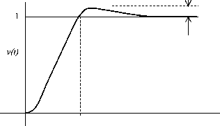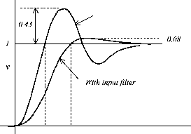FIGURE 27.76 Simplified representation of Fig. 27.75. Ei(s) Rf/Ri 0- Gc(s) Ga(s) Gl(s) Ht(s) H/s) FIGURE 27.77 Further simplified representation of Fig. 27.75. the frequency bands of all other blocks, then the foregoing systems can be represented by a transfer function of the form G,(s) = К (l+5Ti)(l+5T2)(l+5T3)(l+5T4). (27.80) When T3 and T4 are much smaUer time constants than and t2, the preceding may be approximated by Gi(5) = К (1 + 5Ti)(l + sTXl + sT,) (27.81) where = T3 + T4 H----, etc. A dc-motor speed-control system with current and speed sensors faUs in this category. For such a system there exist two dominant time constants (poles). For such a system, a proportional plus integral controUer is of the form (1 + 5Ti)(l + 5T,) 5T,(1 -h 5Tpi)(l + -2) (27.82) One optimization criterion (Kesslers) stipulates that T, T2 t2, and = 2KT. With this stipulation, the transfer function of the complete system is given by G(5) = Gi(5)G,(5) = V(s) Vi(s) 1-hG l-h25T,-h252T, (27.83) (27.84) Note that two filter time constants Тр and are included in G(s) for the sake of its reahzabUity. These can be relegated to frequencies far higher than the range of interest and can be 0.043 ![]() 4.7L t FIGURE 27.78 Response of the optimized system of Fig. 27.75. ignored for further analysis of the system. For an unit step input of the output v is given by v{t) = 1 - Vle- (2 i) - ( ) A typical output is sketched in Fig. 27.78. If the transfer function Gi(s) has one dominant time constant Ti(s), as for the field current control of a dc motor, a suitable controller is the form (I+5T1) 5T,(1 + sTp) In some cases, the transfer function Gi(s) is of the form К (27.86) G,(s) = 5Ti(l+5T2)(l+5T,) (27.87) where is the sum of a number of short time constants, associated with sensors, switching frequency, and so on. The current controUer of the dc motor with back emf has such a characteristic. A suitable PI controUer for this system is G,(5) = (1 + 5Ti)(l + 5T2) (27.88) 5T1 -h 5Tpi)(l + 2) For this system, Kesslers optimization criterion stipulates that = T2 = t2, and T, = The transfer function of the complete system is then V(s) 1 -h 45T, Vi(s) 1 -h 45T, -h 852 Tj -h 85З (27.89) The peak overshoot of this system to a unit step unit is usually unacceptable, as indicated by the response of Fig. 27.80. This