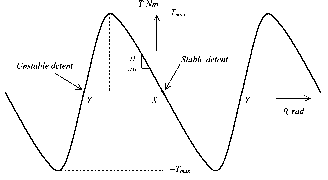 G/s) G,(s) FIGURE 27.79 Block diagram representation of a typical current controller. Without input filter ![]() 3.1Ts 7.6Ts Time, msec FIGURE 27.80 Optimized response of the system of Fig. 27.79. overshoot is usually reduced by inserting a first-order filter in the reference circuit. The filter network and the responses are given in Fig. 27.79. 27.7.7 Further Reading 1. George W. Younkin, Industrial Servo Control Systems: Fundamentals and Applications. Marcel Dekker, 1996. 2. B. C. Kuo and J. Tal, Incremental Motion Control 1: DC Motors and Systems. SRL Pubhshing, 1978. 3. D. Shetty and R. Kolk, Mechatronics Systems Design. PWS Publishing, 1997. 4. A. Fransua and R. Magureanu, Electric Machines and Drive Systems. Techical Press, Oxford, 1984. 27.8 Stepper Motor Drives M. F. Rahman 27.8.1 Introduction A stepper motor is a positioning device that increments its shaft position in direct proportion to the number of current pulses supplied to its windings. A digital positioning system without any position or speed feedback is thus easily implemented at a much lower cost than with other types of motors, simply by delivering a counted number of switching signals to the motor. Typically, a 200-steps-per-revolution stepper motor with 5% stepping accuracy will be equivalent to a dc motor with a 12-bit (or 4000 counts/rev) encoder plus the closed-loop speed and position controllers for obtaining similar positioning resolution. This advantage, however, is obtained at a cost of increased complexity of the drive circuits. A disadvantage of the motor is perhaps its inability to reach an absolute position, since the final position reached is only relative to its arbitrary initial position. Nevertheless, the true digital nature of this motor makes it a very suitable candidate for digital positioning systems in many manufacturing, automation, and indexing systems. The working principle of stepper motors is based on the tendency of the rotor to ahgn with the position where the stator flux becomes maximum (i.e., seeking of the minimum-reluctance position, also called the detent position). The rotor and the stator are both toothed structures, and the stator normally has more than two windings to step the rotor in the desired direction when they are energized in certain combinations with current. Some motors additionally have permanent magnets embedded in the rotor that accentuate an already existing, zero-excitation detent torque. These motors hold their positions even when the stator excitations are removed completely, a feature desirable for some applications. In addition to the point-to-point stepping action, these motors can also be operated at high slewing speed, simply by increasing the pulsing rate of phase currents. Since the motor is inherently a synchronous actuator, the pulsing rate has to be increased and decreased properly, so that the rotor may follow it. At the end of a complete run, the motor always stops at the desired incremental position or angle without any accumulated error. The only error that may be encountered is mainly due to the machining accuracy of the teeth in the stator and rotor. This error is of the order of about 5% of one step position/angle and it is nonaccumulative. 27.8.2 Motor Types and Characteristics 27.8.2.1 Single-Stack Variable-Reluctance Stepper Motor Single-stack motors are normally of the variable-reluctance type with no excitation in the rotor. The cross section of a three-phase motor with two stator poles/phase and four rotor poles are indicated in Fig. 27.81. The motor can be stepped clock or anticlockwise by energizing the phase winding in the ABCA or ACBA sequence, respectively. The step angle, i.e., the angle moved by rotor for each change in excitation sequence, of the motor is given by 360° (27.90) where N is the number of phases in the stator and p is the number of poles in the stator. Single-stack motors typically has larger step angles than other types because of hmitations of ![]() X../ FIGURE 27.81 Cross section of a single-stack variable-reluctance stepper motor. space for the windings. The step angle of these motor tend to be larger than the multistack and hybrid stepper motors. For each excited winding, the motor develops a torque-angle (Т-в) characteristic as indicated in Fig. 27.82. Note there are two equilibrium positions of the rotor, namely, X and 7, where the motor develops zero torque. The position X is referred to as the stable detent position, around which the rotor develops a restoring torque when displaced. The restoring torque increases as the rotor is moved from its detent position, becoming a maximum T on either side of this position. The slope of the Т-в characteristic around this detent position and the maximum torque, both of which depend on the level of excitation, indicate how far the rotor wiU be displaced under load torque. This means that the level of excitation also affects the position holding accuracy of the motor. The motor may also be excited in the sequence: AB-BC-CA or AB-CA-BC for forward and reverse stepping, respectively. The two phases-on scheme develops more torque around the detent positions at the expense of twice the resistive losses. Yet another excitation scheme is AB-B-BC-C-CA-A-AB for forward stepping and AB-A-AC-C-BC-B-AB for reverse stepping. In this scheme, the step size is halved as opposed to the full-step size of the previous sequences. Two different levels of torque is produced for alternate detent positions. Fiowever, the reduced step size and the more damped nature of each step may outweigh this disadvantage. 27.8.2.2 Multistack Variable-Reluctance Stepper Motor In a multistack variable-reluctance motor, the stator windings are stacked along the shaft. Each stack section now has the same number of poles in the stator and the rotor. Normally each stator stack is staggered with respect to its neighbor by one Nth of a pole pitch, where N is the number of stator/ rotor phases or sections. The cut