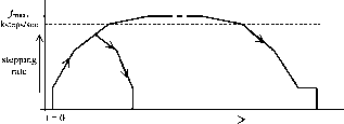 (a) (b) FIGURE 27.92 Drive circuits for one phase of a bifilar-wound motor, (a) Bifilar pole windings; (b) drive circuits. T, Nm T, Nm T,Nm Phase A Phase В Phase С FIGURE 27.93 Т-в characteristics of a three-phase variable-reluctance motor. 27.8.6 Microstepping The drive sequences mentioned in Section 27.8.2 normally switch rated current through the motor windings. These produce regular step angles. The half-stepping operation also uses rated motor currents. Halving of the step angle is arranged mainly through the selection of the windings switched. In microstepping, the regular step angle of the motor is subdivided further by a factor, typically from 10 to 100, by energizing the winding partially, with combinations of currents ranging from zero to full rated value in more than one winding simultaneously. This does not lead to any sacrifice of the developed torque, since the phase currents are so selected that the peak of total torque contributed by two partially energized windings is not lower than the peak detent torque Tjax obtained in regular stepping. The idea behind microstepping is readily understood when it is considered that by increasing the current in phase A of a two-phase hybrid in 10 equal steps to full value and decreasing the current in phase Б in a similar manner, the motor step size may be divided by a factor of 10. If closed-loop current controllers are added to the two drive circuits of Fig. 27.91 and distinct current references are obtained from a reference generator, a complete microstepping drive is realized. In microstepping, the two current references must have values such that the motor does the following: 1. Develops the same T for every combination of winding currents 2. Develops the same torque slope, i.e., dT/dO at every microstepping detent position 3. Dissipates no more than the rated power loss (IR) for every combination of winding currents The preceding conditions are necessary if the motor is to retain its static accuracy, maximum torque, and power dissipation characteristics. The static torque characteristics (Fig. 27.92) of stepper motors are close to but not exactly sinusoidal functions of angle 9. The required current references for all windings of a stepper motor, including the variable reluctance motor of three or more phases, can easily be calculated from the data of the Т-в characteristics of the motor for each phase for various currents and rotor positions. A typical set of Т-в data for a three-phase variable-reluctance motor is shown in Fig. 27.93. The application of the three conditions mentioned earlier leads to an unique set of current references for each phase of the motor for each microstep. Figure 27.94 shows the current references for this motor for microstepping. In multistepping operation, these microstepping current references have to be issued to the current controllers for each phase, at a rate determined by the commanded stepping rate. Care has to be taken in designing the phase current controllers so that actual winding currents match the current references in both single and multistepping operation up to the maximum stepping rate desired. Since the current references are time varying, high-bandwidth current controllers are normally required to cover the desired speed range. ![]() Time, t FIGURE 27.95 Typical acceleration/deceleration profiles. 27.8.7 Open-Loop Acceleration-Deceleration Profiles As mentioned in Section 27.8.4, many applications require the stepper motors to be driven far above the stepping rates to and from which the motor can start and stop abruptly without losing or gaining any step. This caUs for carefully designed acceleration/deceleration profiles that the stepping pulse rate must not exceed. The number of steps the motor is to be stepped and its direction are normally under the control of the motion controller. Once this reference is known, a digital timer/coun-ter circuit can be used in the controller to progressively adjust the time between the stepping pulses such that a prescribed acceleration/deceleration profile, as indicated in Fig. 27.95, is followed. The timer/counter and the pulsing sequence controller (the translator) need to be managed in real time to execute the motion-control task at hand. The fastest acceleration-deceleration profile a stepper motor is capable of is largely determined by its puU-out (T-co) characteristic, which in turn is determined by the motor winding parameters and the drive circuit. An optimized stepping profile to and from the top speed may have a number of segments, as indicated in Fig. 27.95. These profiles are easily computed from the pull-out (Т-ш) characteristic by integrating the dynamic torque balance equation of the drive. For a large positioning angle, the entire profile, including some constant-speed running at the top speed, may be used. For short positioning angles, only part of the profile may be traversed. In general, a single-segment acceleration-deceleration profile is used in commercial stepper motor controllers, so as to avoid a great deal of realtime number crunching by the profile controUer. The overaU stepper motor controller thus consists of the blocks depicted in Fig. 27.96.